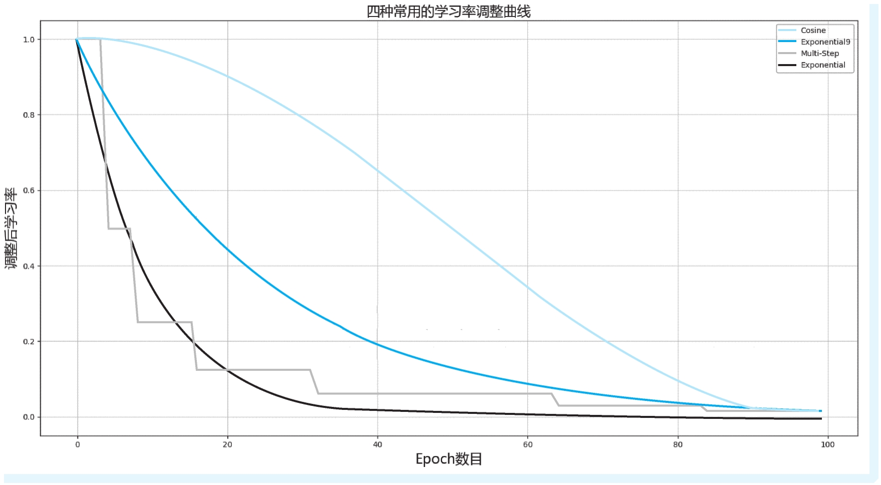 具体使用哪个调度器进行学习率调整,并没有定规,常用的方法是先分别试用余弦和指数调度器,取其优者,这两种调度器都不需要太多的参数设置,非常方便。在最后获得最优模型后,再使用多步调度器对模型进行最后微调,将精度推至极限。