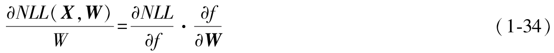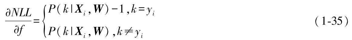 反向传播算法让求导计算变得非常简单,每一层都只需要关注本层的求导问题。例如,式(1-34)中计算 NLL 损失函数对 f 的导数时,完全不需要考虑神经网络的参数 W 。如果将式(1-32)代入式(1-34)求 NLL 对 f 的导数,会发现导数的形式极其简单: