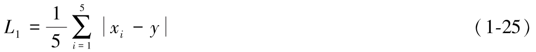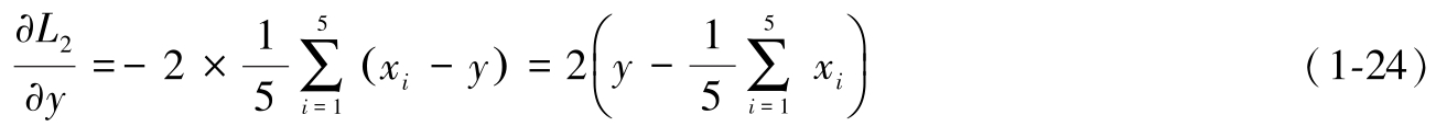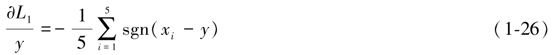 显然,当 y 等于5个测量数据点的平均值时梯度为0。因为式(1-23)是凸函数,于是梯度为零的位置也是L2损失函数的极小值所在的位置。所以 使用L2损失函数就意味着用求平均值的方法进行推断, 最后求得的 y 值为0.97。如果使用L1损失,损失函数就变成了: