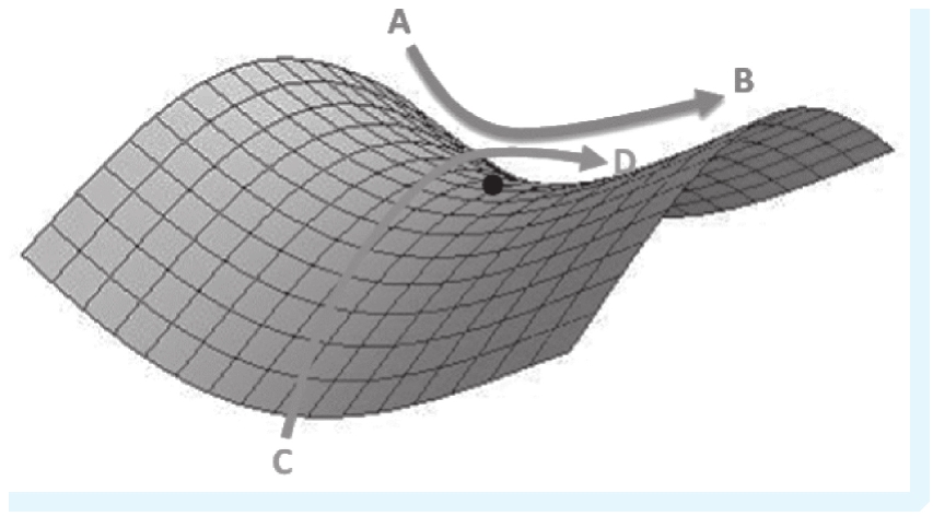 仔细观察会发现,RMSprop在对参与更新的梯度进行负反馈式的缩放,而且是各个权重单独计算的,也就是说会针对每一个权重的历史梯度进行适配。RMSprop会对历史梯度大的权重缩小学习率进行“刹车”,使之得以下探到更深的极小值。同时,对于历史梯度小的权重,RMSprop也会对这些梯度进行负反馈,让这些梯度小的权重“加速”往外闯。通过对不同权重进行“刹车”和“加速”,RMSprop解决了优化算法中著名的鞍点问题(见图1-40)。