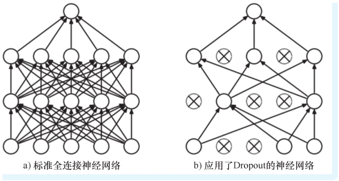 L1和L2正则化适用于很多机器学习方法,如多项式回归、逻辑斯蒂回归、支撑向量机等。但有一个正则化方法是针对神经网络的,那就是Dropout。Dropout的原理很简单,就是在训练过程中随机切断全连接网络里的一些连接(见图1-37)。