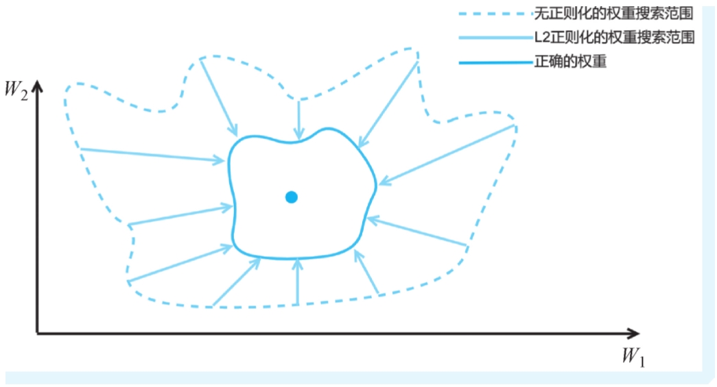 图1-35是对神经网络参数的一种高度简化。横轴和纵轴代表了两个参数 W 1 和 W 2 ,虚线圈代表的是没有任何正则化情况下神经网络参数覆盖的搜索范围。所谓搜索范围,就是在训练过程中参数达到过的值围成的区域。加入了L2正则化之后,优化器会让权重值变小,等于压缩了搜索范围,于是加入L2正则化之后的权重搜索范围就大大缩小了,变成了如图1-35中所示的深色实线标记的区域。因为L2正则化对极端值有更强的压缩效果,所以原始搜索范围的很多棱角都被压平,因而实线所标记的搜索范围也更加规整。而优化器寻找的正确权重则是图中的点,显然,通过压缩搜索范围,最终达到最优解的可能性大大增加了。