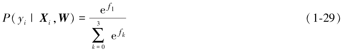 根据Softmax激活函数,式(1-27)中的条件概率可以用以下公式表达: