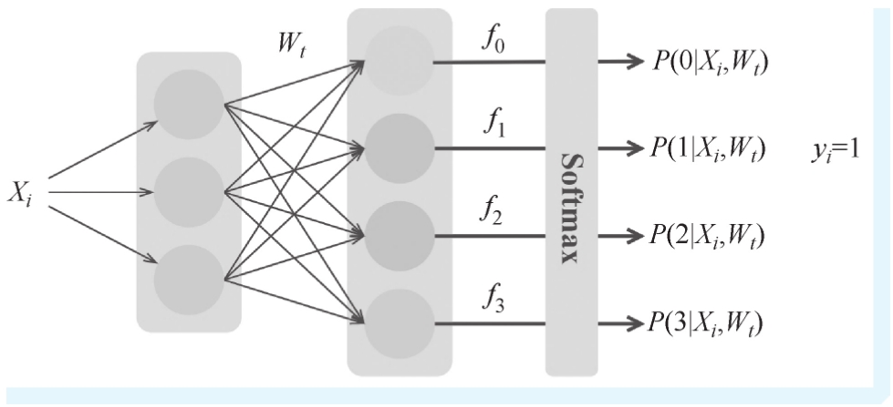 分类任务的损失函数和回归任务大不相同。如前文所述,分类任务输出的是概率值,如果预测目标分为 K 个类别,那就会输出 K 个概率值。假设数据集中某一个样本 X i 的类别是 y i ,当前模型的参数是 W t ,使用Softmax作为输出层,则当前模型输出如图1-34所示。
