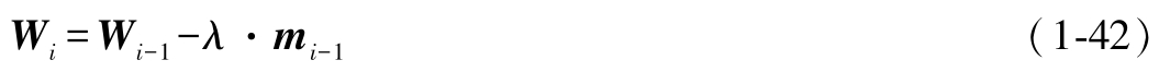 式中, λ 是学习率, g i -1 是梯度。如果使用动量,每次更新时使用的就不是梯度了,而是动量: