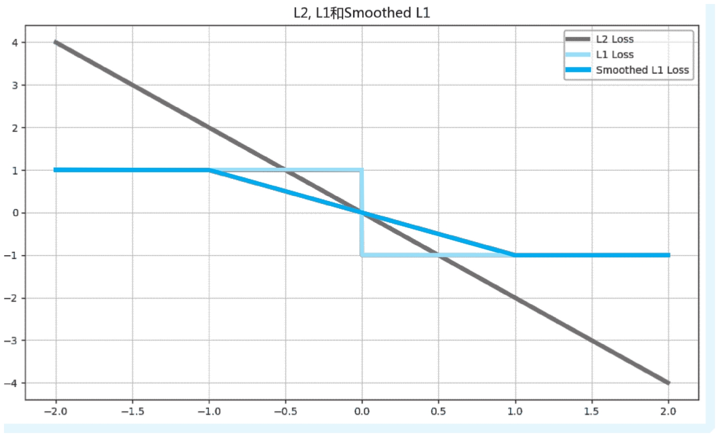 图1-33中颜色最浅的线是L1损失的梯度,颜色最深的线是L2损失的梯度,两者中间的线为平滑L1损失的梯度。可以看出来,L2损失随着误差的变化平滑变化,但如果某一个样本误差太大,会产生一个很大的梯度,可能导致训练不稳定。L1损失在0附近的梯度忽然从1变成-1,也会导致不稳定。而绿线则结合了两者的优点,不会因为大的样本误差产生大的梯度,也不会在0附近产生梯度的骤变,因此被称为平滑L1损失。