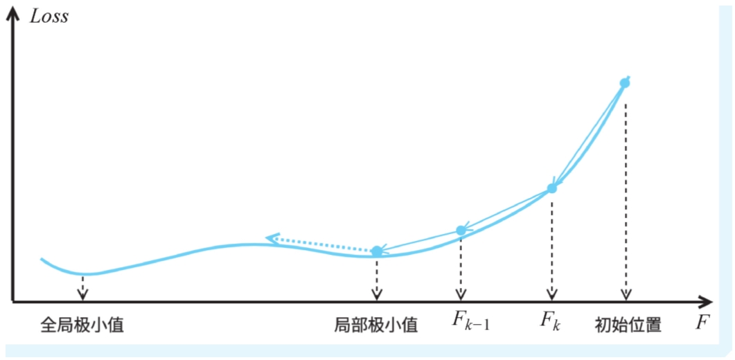 仍然使用前文使用过的讲解梯度下降算法的例子。如图1-38所示,横轴代表的是神经网络的参数点,每一个点都代表了整个模型的参数,纵轴是损失值,代表的是在已有模型参数的情况下,模型在数据集上进行推断之后通过损失函数得到的损失值。