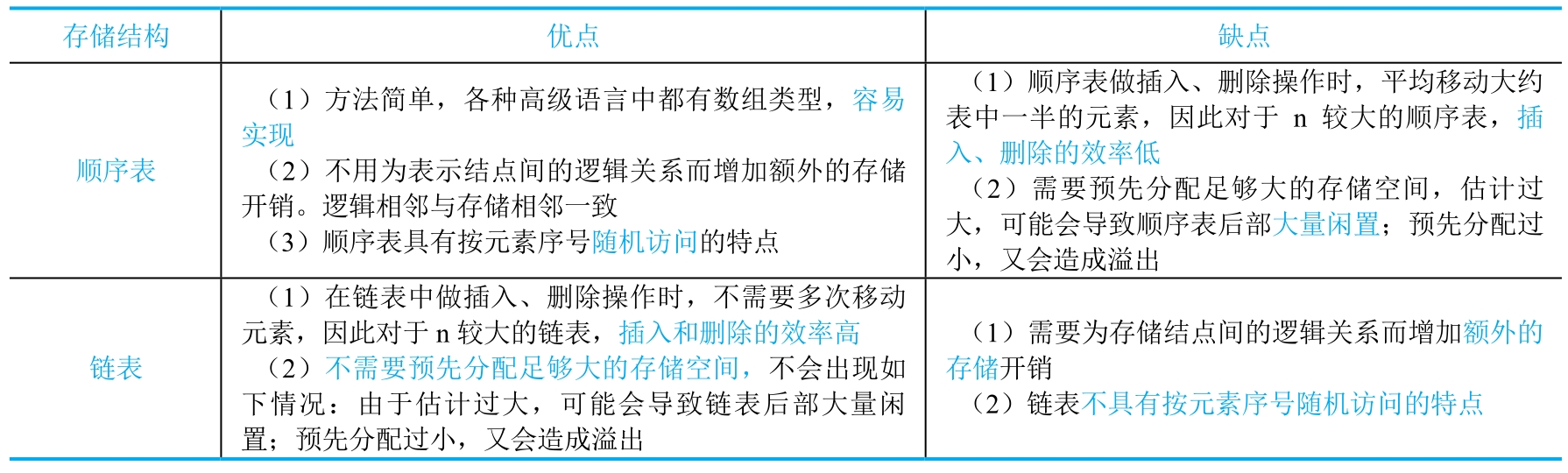 表2-1 顺序表和链表的比较