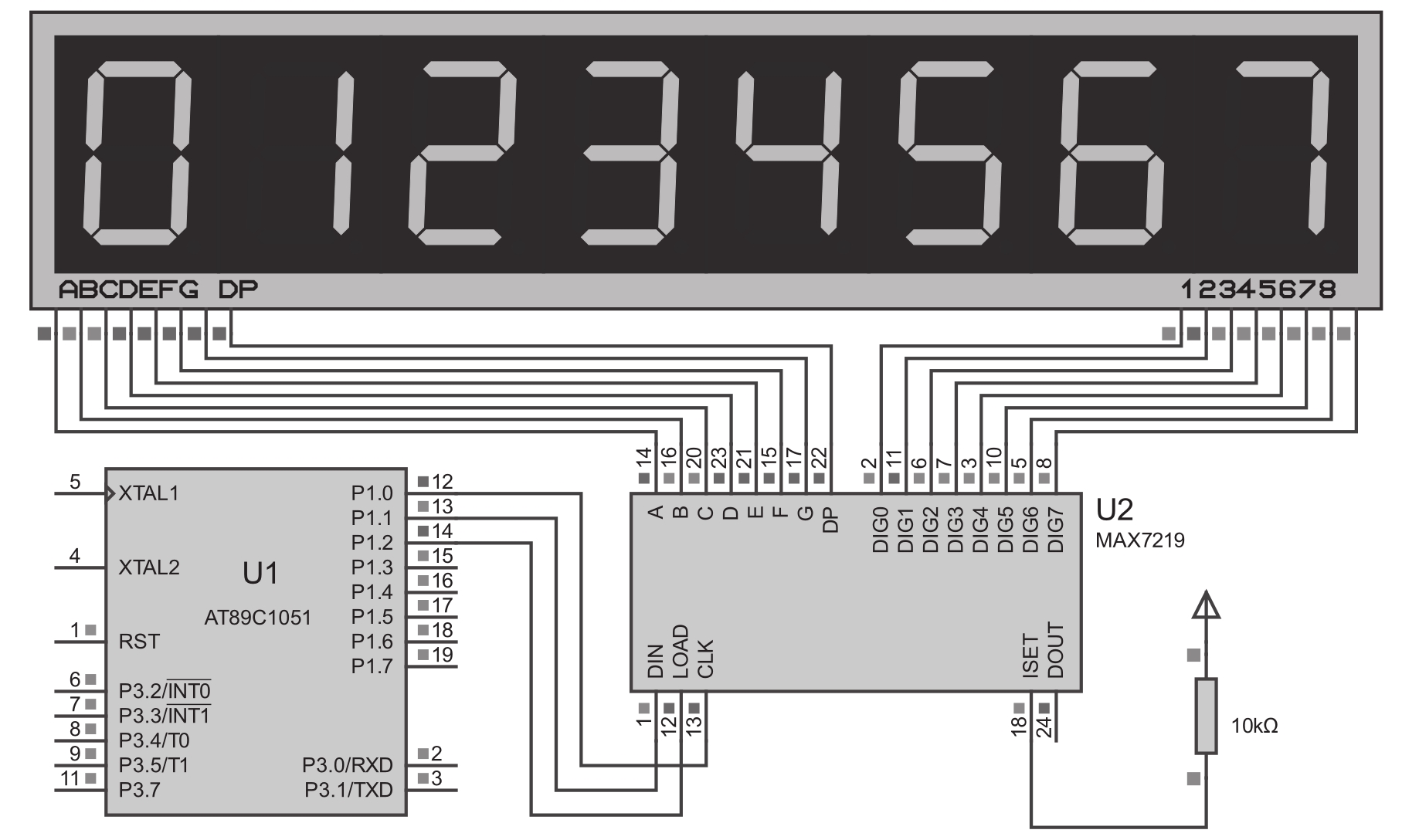 新方案的硬件电路非常简洁,使用了一片可以驱动最多8位数码管( 只能是共阴极 )的MAX7219芯片,它内部集成了 动态扫描时序生成电路 ,仅需要3条信号线即可完全受控于单片机。MAX7219的段驱动输出引脚A~F与数码管的各段连接,位选通输出引脚DIG 0 ~DIG 7 则与数码管的位选通连接,而外围器件只需要一个用来调整流过数码管工作电流的电阻即可,选取的阻值与电流之间的关系见表10.2。