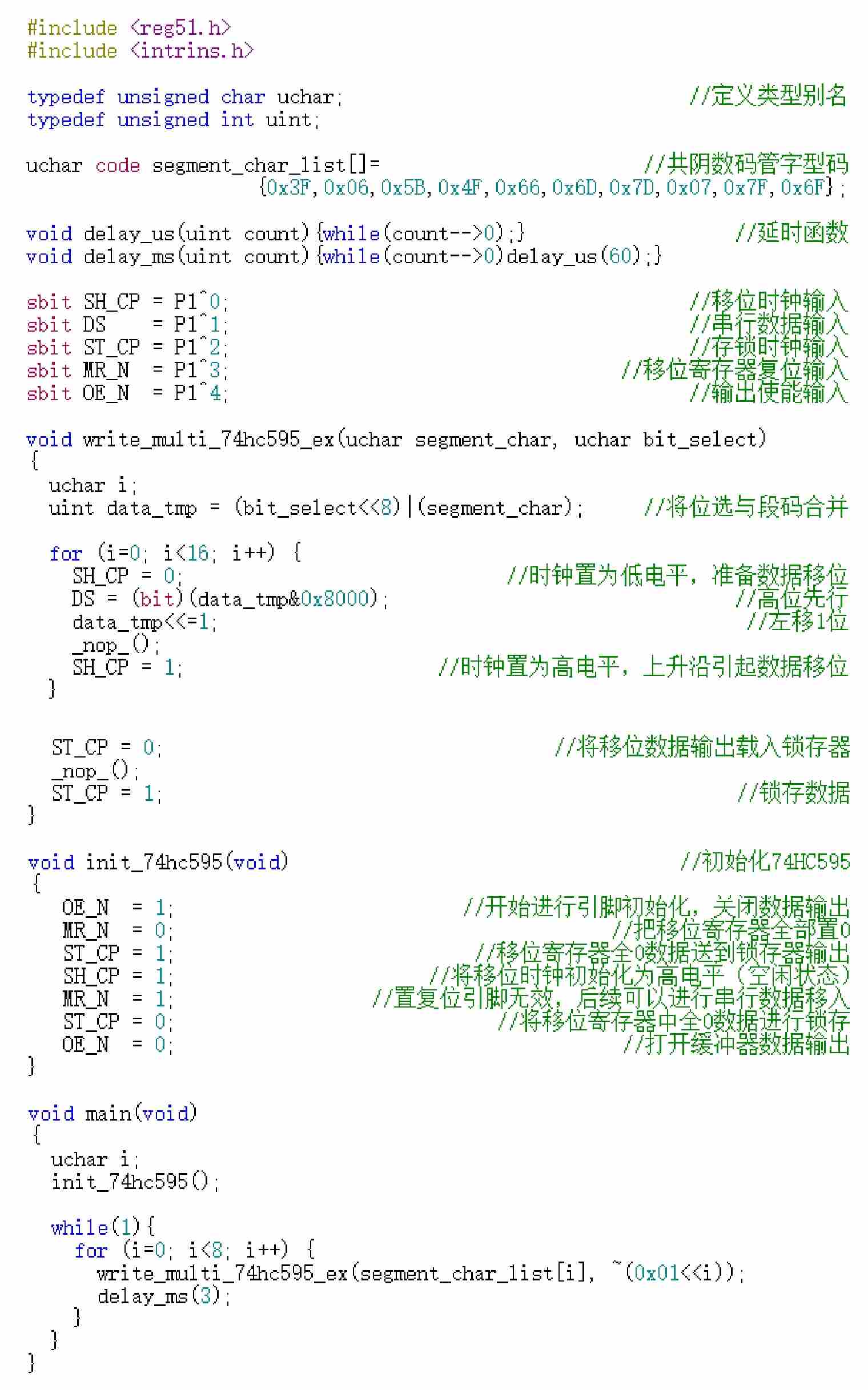 先来看一下write_multi_74hc595_ex函数,只要给它传入共阴字型码与位选通数据,单片机就可以把它们推送到74HC595的数据输出引脚。首先将位选通左移8位再与字型码进行位“或”运算,也就可以实现位选通与字型码的合并。由于位选通与字型码都是8位的,所以将合并后的数据赋给了临时的16位无符号整形变量data_tmp,这样就可以把16位数据一次性写入。接下来发生的事就很容易预料到,需要将16位数据移位16次,并且同样是高位先行。main主函数代码比较简单,只是在while语句中循环执行写入数据到74HC595的操作,每写入一位则延时约3ms。