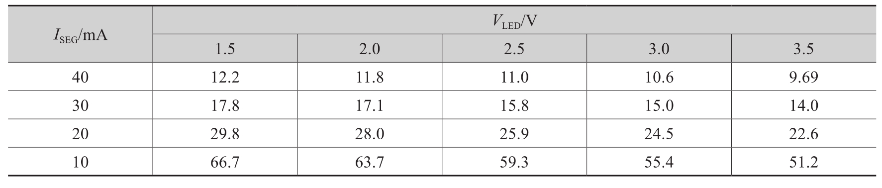 表10.2 限流电阻与工作电流I SEG 及正向导通电压降V LED 之间的关系