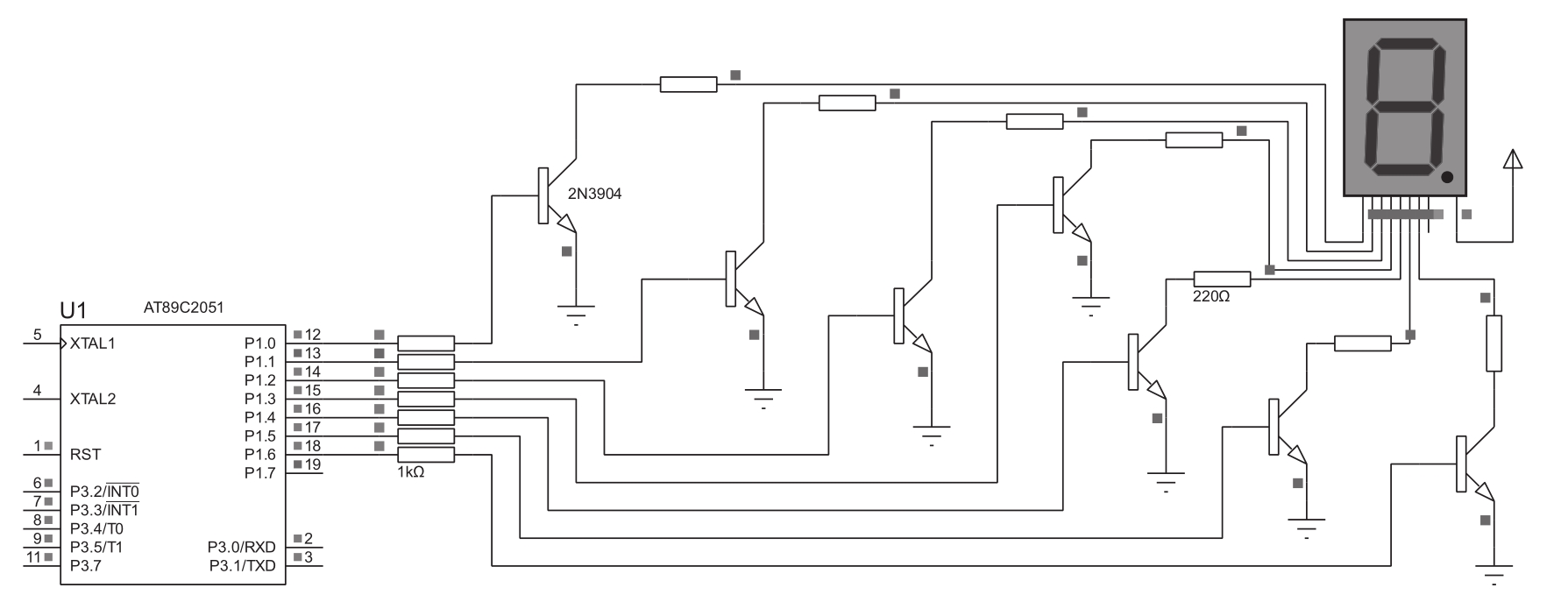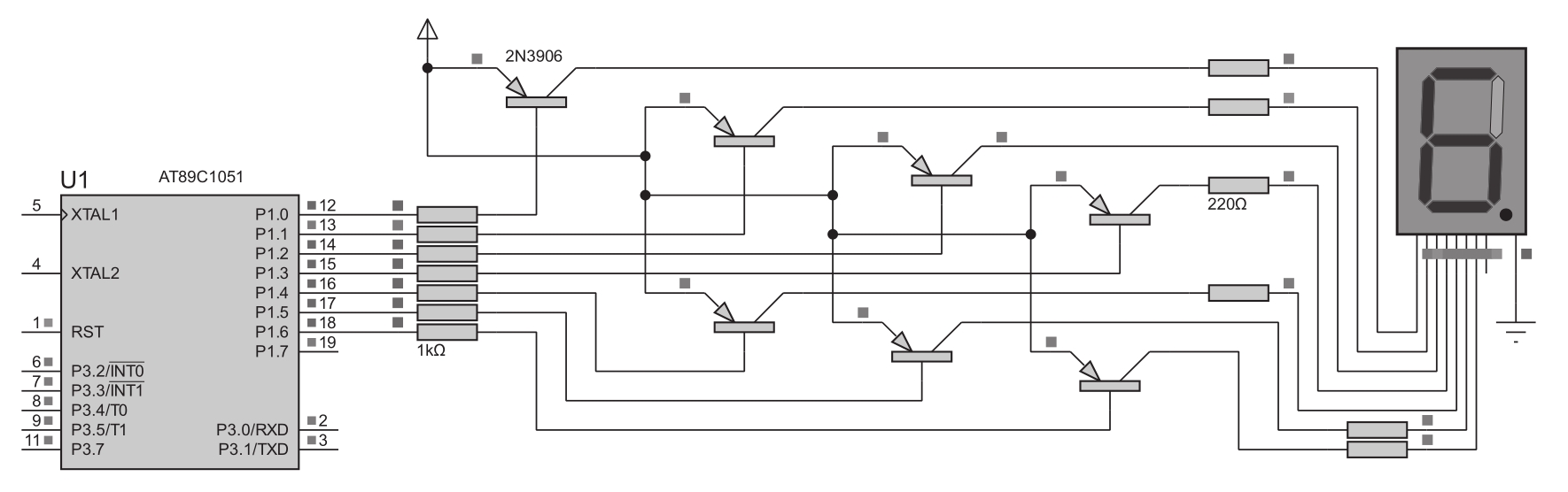 在使用单片机产生控制电平时,一般不使用引脚直接驱动数码管,因为需要的控制引脚数量比较多,单片机消耗的总电流可能会比较大,容易引起发热而导致系统不稳定。最常用的方法就是使用三极管间接驱动, 共阴 数码管的驱动方案仿真电路如图4.6所示。
