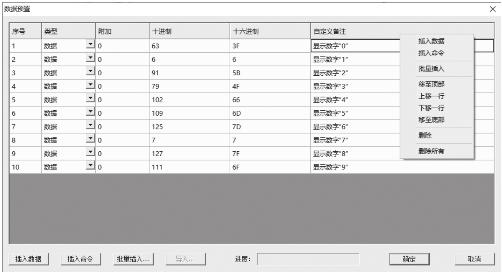 “预置数据”对话框中有一个表格,可以插入想要的数据行。其中,“ 类型 ”栏中可以是 数据 或 命令 ,对于数码管这类简单的显示器件而言没有意义。“ 附加 ”栏是扩展项,仅对特殊的器件有效。“ 十进制 ”与“ 十六进制 ”栏表示插入的具体数据或命令,两栏的数据完全一样,当向“十进制”栏输入“63”,“十六进制”栏中就会显示“3F”,反之亦然,这可以方便不同的进制数据输入的场合。“ 自定义备注 ”栏可以为插入的行做注释。