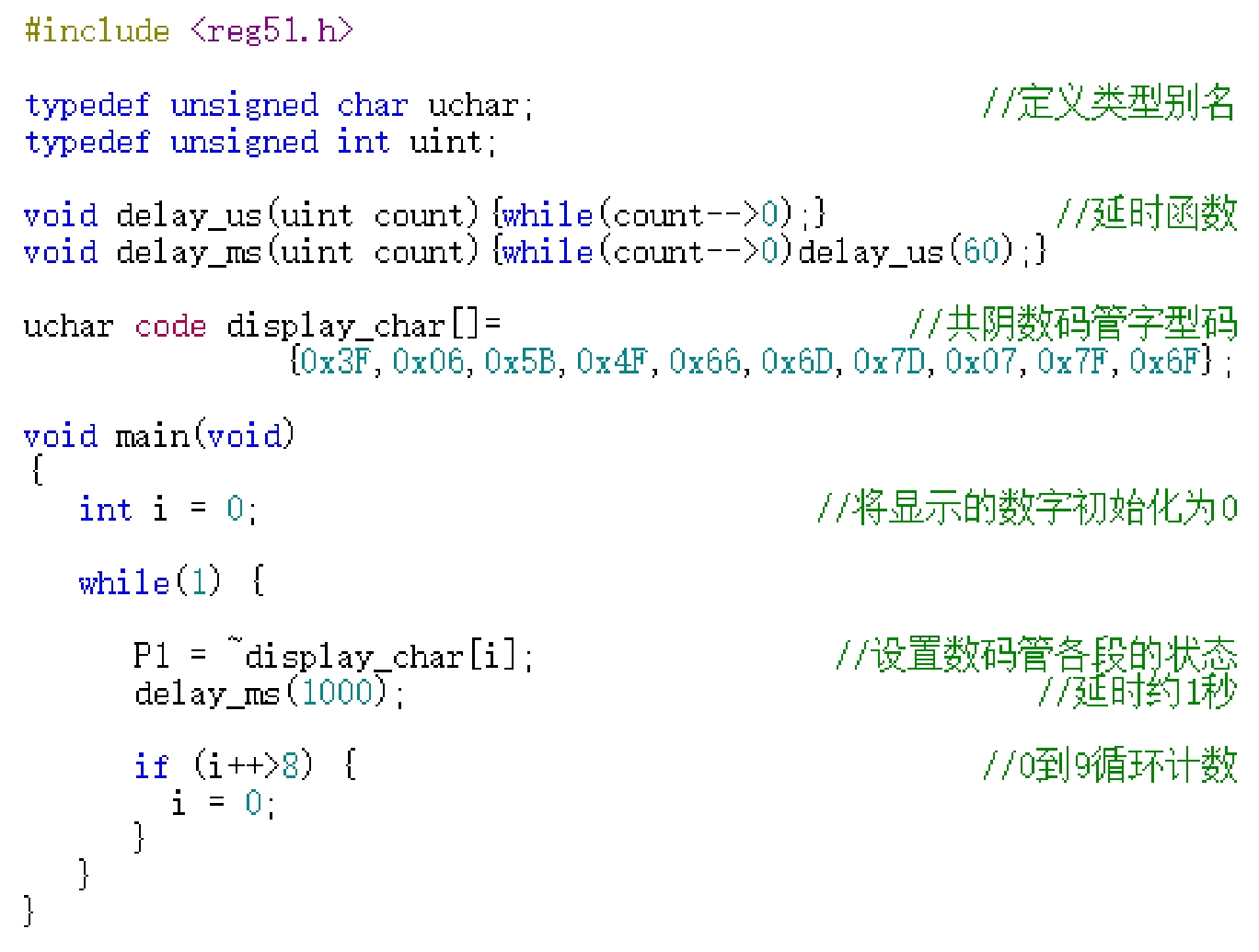 接下来发生的事情就很容易预料到了,在main函数中,我们定义了一个变量i保存将要显示的数字,同时将其初始化为0,表示将要从0开始显示。然后在while语句中利用变量i从display_char数组中查到数字0对应的字型码赋给P1口,也就能够将数码管显示数字0。紧接着我们延时约1秒后再对变量i进行累加,变量i每变化一次就能够使数码管显示相应的数字。当变量i累加后的值大于8(也就是当前显示数字为9)时置0,然后循环执行上述过程即可。