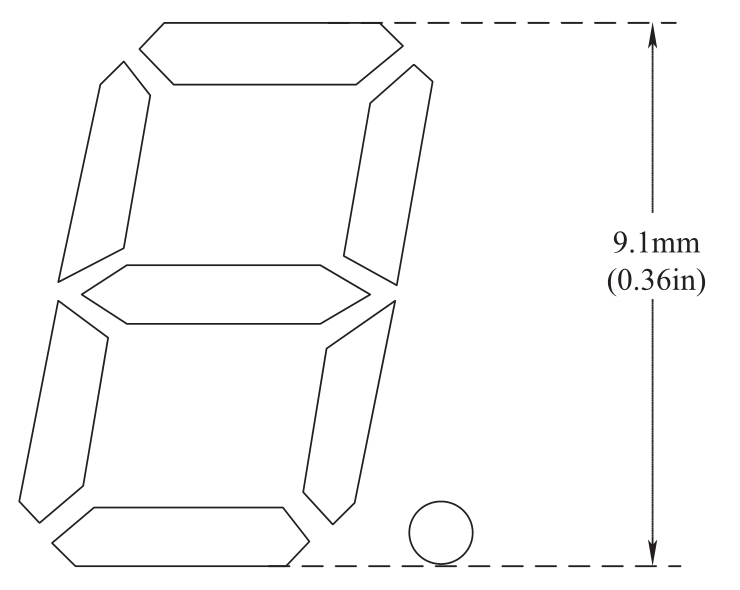 一位数码管通常有两种引脚排列方式,图4.1b所示排列方式一般存在于尺寸比较小的数码管中(例如9mm),这样可以使引脚的间距不会那么紧张(因为数码管的宽度比较小)。这里所说的9mm指的是数码管“8”字的高度,换算成英制单位就是0.36in(英寸),如图4.2所示。