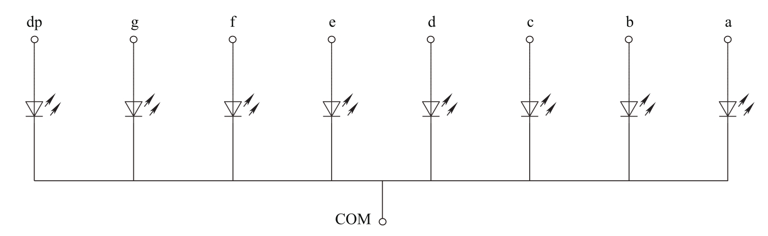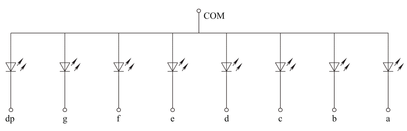 还有一种共阴极类型的LED数码管,它将所有LED的阴极连接到一起并引出一个公共阴极(COM)。与共阳数码管恰好相反,在实际应用时,COM引脚应该接低电平(通常是公共地),相应的内部电路如图4.5所示。