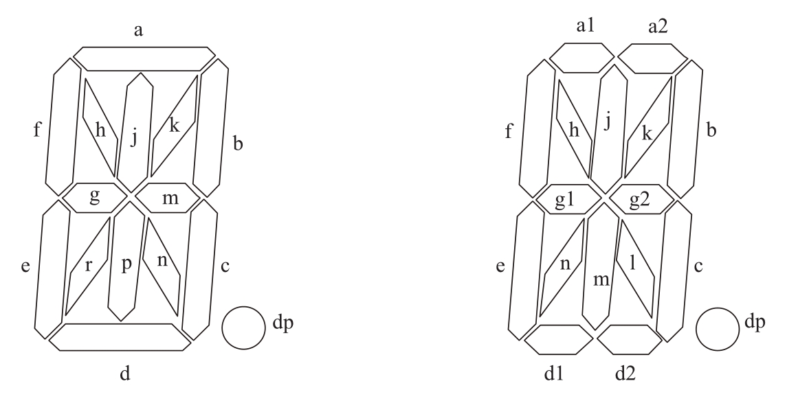 还有一种“米”字形数码管,其内部结构与“8”字形数码管完全一样,只不过具有更多的发光段而已,在此我们仅给出两种“米”字形数码管的常用段定义,如图4.10所示。