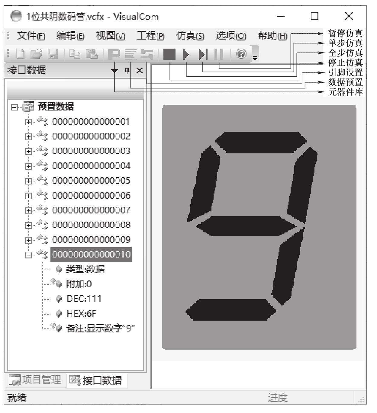 图4.13中的预置数据为0b0_0110_1111(0x6F),也就是数字“9”的共阴字型码。如果还需要同时点亮小数点与冒号,则相应的预置数据应为0b1_1110_1111(0x1EF)。我们在图4.12中预置了表4.1所示数字0~9的字型码,单击“确定”按钮后返回主窗口,每执行一次“单步运行”就会执行一条预置数据,多次执行“单步仿真”即可观察到数码管依次显示数字0~9,“接口数据”窗口中会显示当前处理的预置数据。另外,VisualCom软件平台也有“米”字形数码管,有兴趣的读者可自行仿真,此处不再赘述。