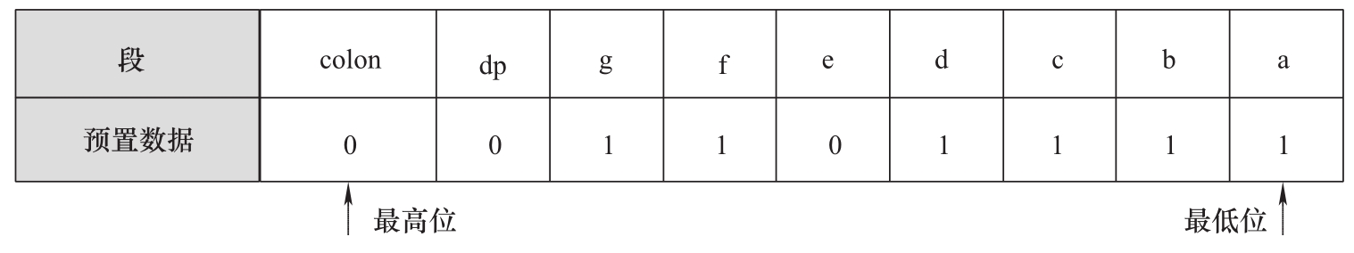 该数码管的段引脚定义与表4.1完全一样,而且还包含了小数点(dp)与冒号(colon),预置数据与段的对应关系如图4.13所示。