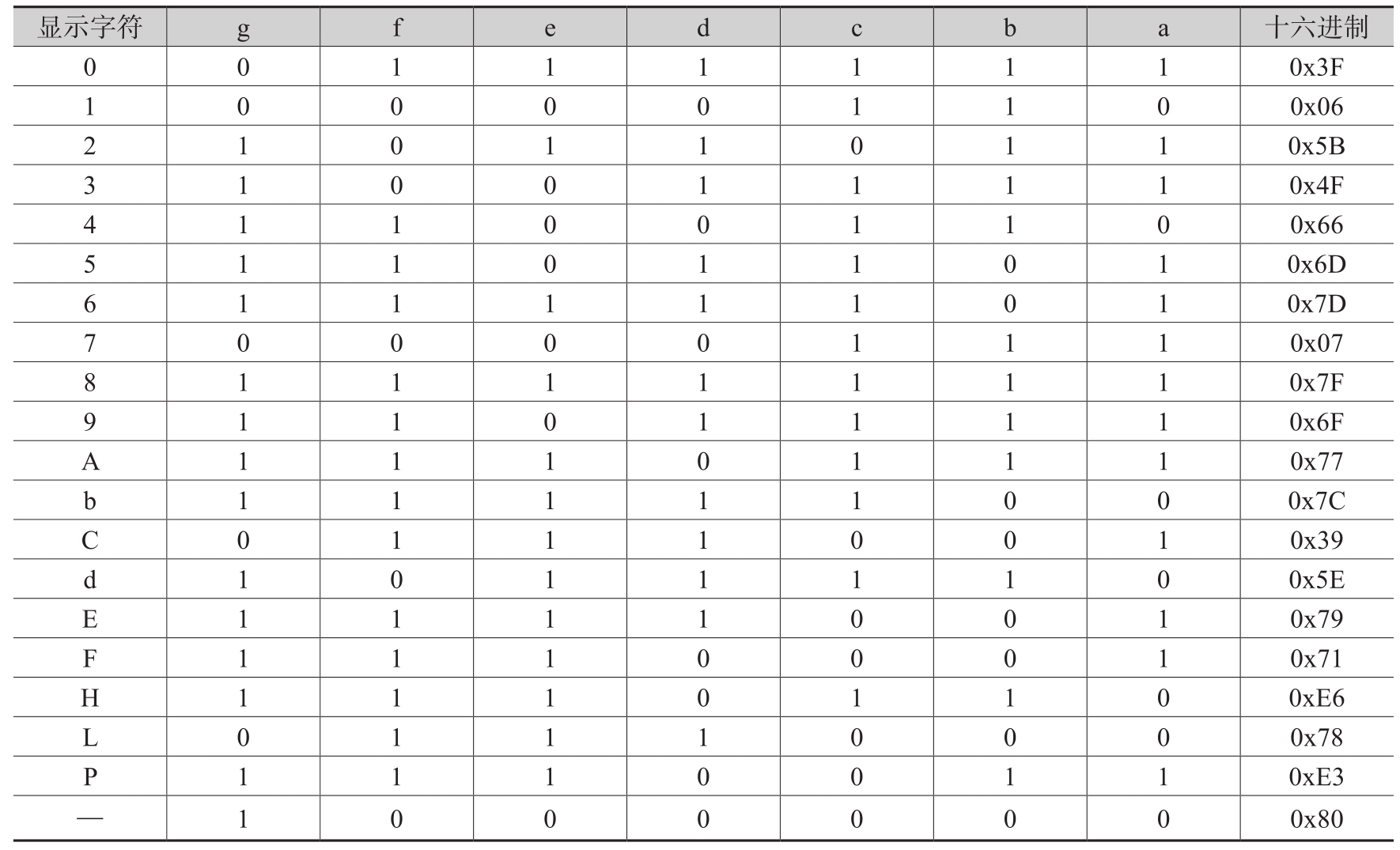 所有段驱动电平的十六进制码称为 字型码 (注意各段对应字型码的位顺序,低位为段a,高位为段g),将共阴数码管的字型码 取反 就可以直接驱动共阳数码管。例如,共阳数码管需要显示字符“6”时,将共阴数码管显示字符“6”所需的字型码0x7D(0b111_1101,下划线为位分隔符,无实际意义,当位数比较多时有助于阅读)全部取反(非逻辑)得到0x02(0b000_0010)即可。