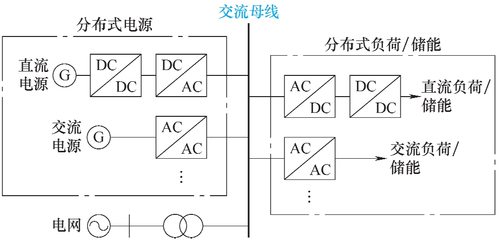 如图1-2所示,不同电压类型的分布式电源、储能装置、负荷等均通过电力电子装置连接至交流母线,其中直流设备通过DC-DC变流器和DC-AC变流器并入微电网母线,交流设备通过AC-AC变流器并入微电网母线。目前,交流微电网是微电网的常见形式。