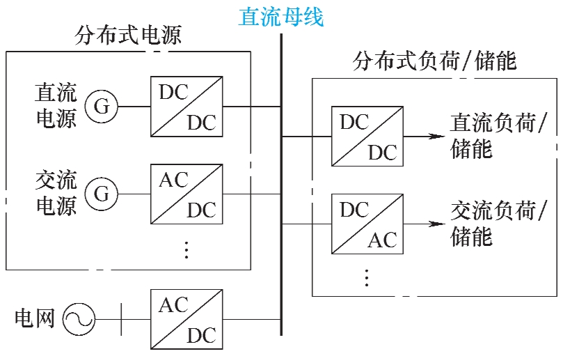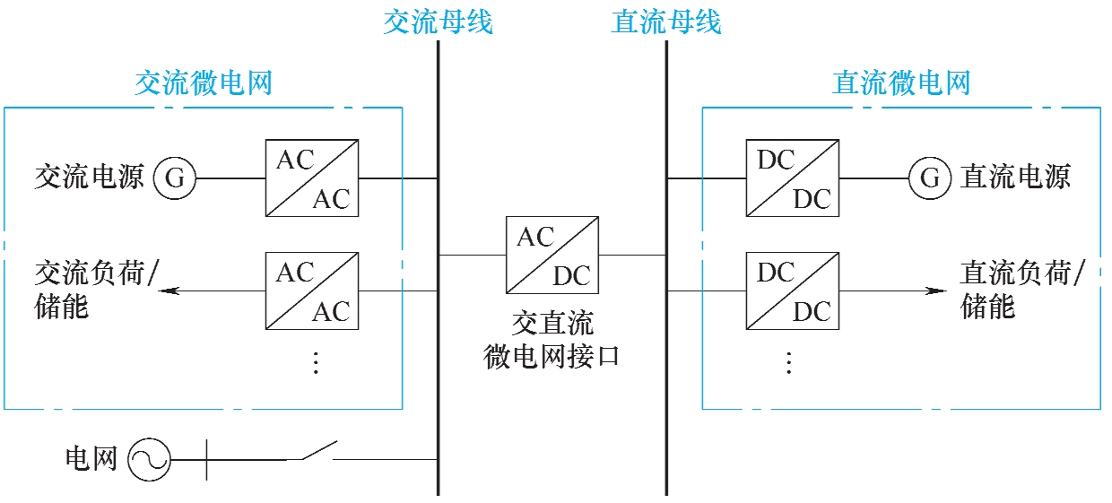 与单一电压母线的微电网相比,交直流混合微电网结合了交流微电网与直流微电网的特点,直流与交流母线的同时存在,可以在交直流负载接入时有效地减少AC-DC或DC-AC变流装置数量,从而降低了系统成本,并提高了效率。