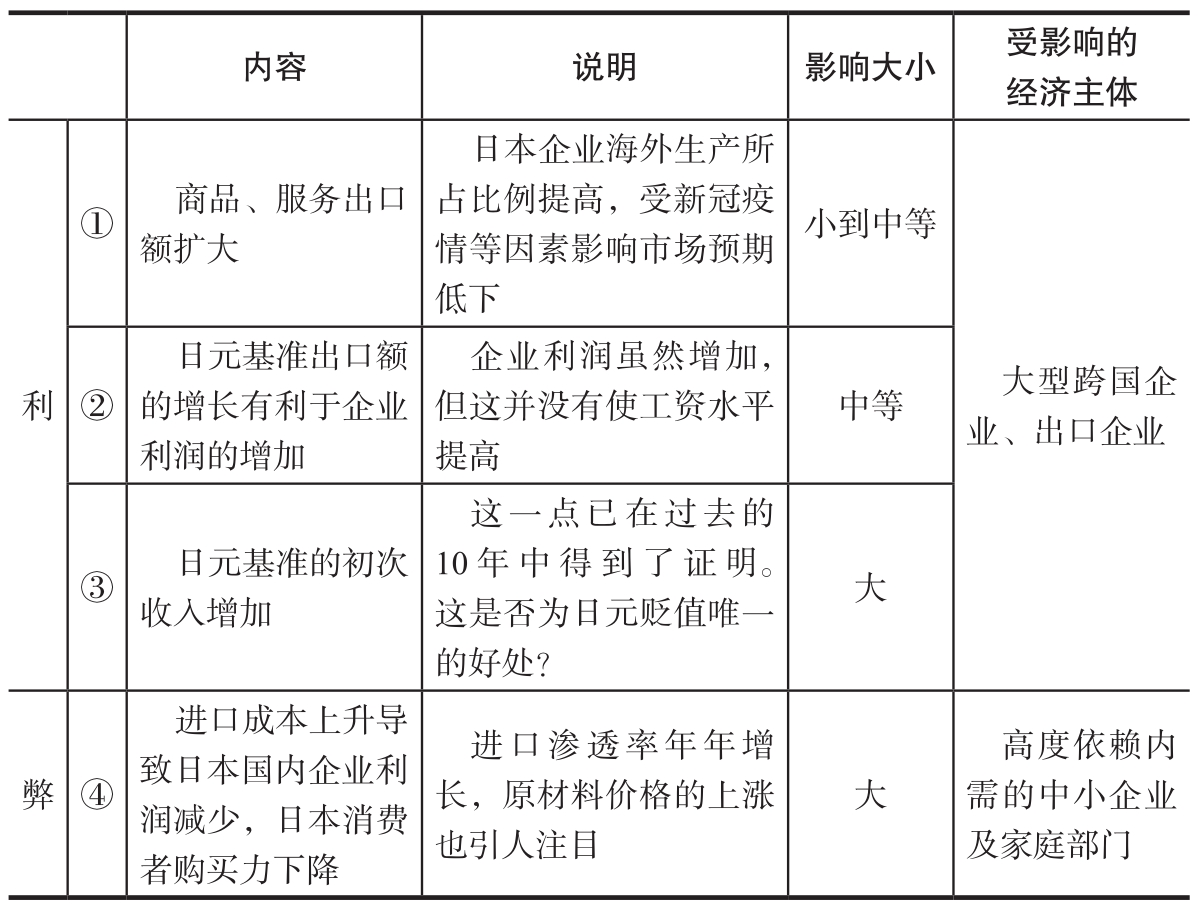 《展望报告》通过计量分析,得出了“日元贬值对日本有益”的结论。表2-1中列出了日元贬值对日本的几点利弊。有利之处包括:①价格竞争力的提高有利于日本商品、服务出口;②日元基准出口额的增长有利于日本企业利润的增加;③有利于日元基准的初次收入的收支情况改善。不利之处包括:④进口成本上升导致日本国内企业利润减少,日本消费者购买力下降。日本央行的基本观点,可以描述为“①+②+③>④”。