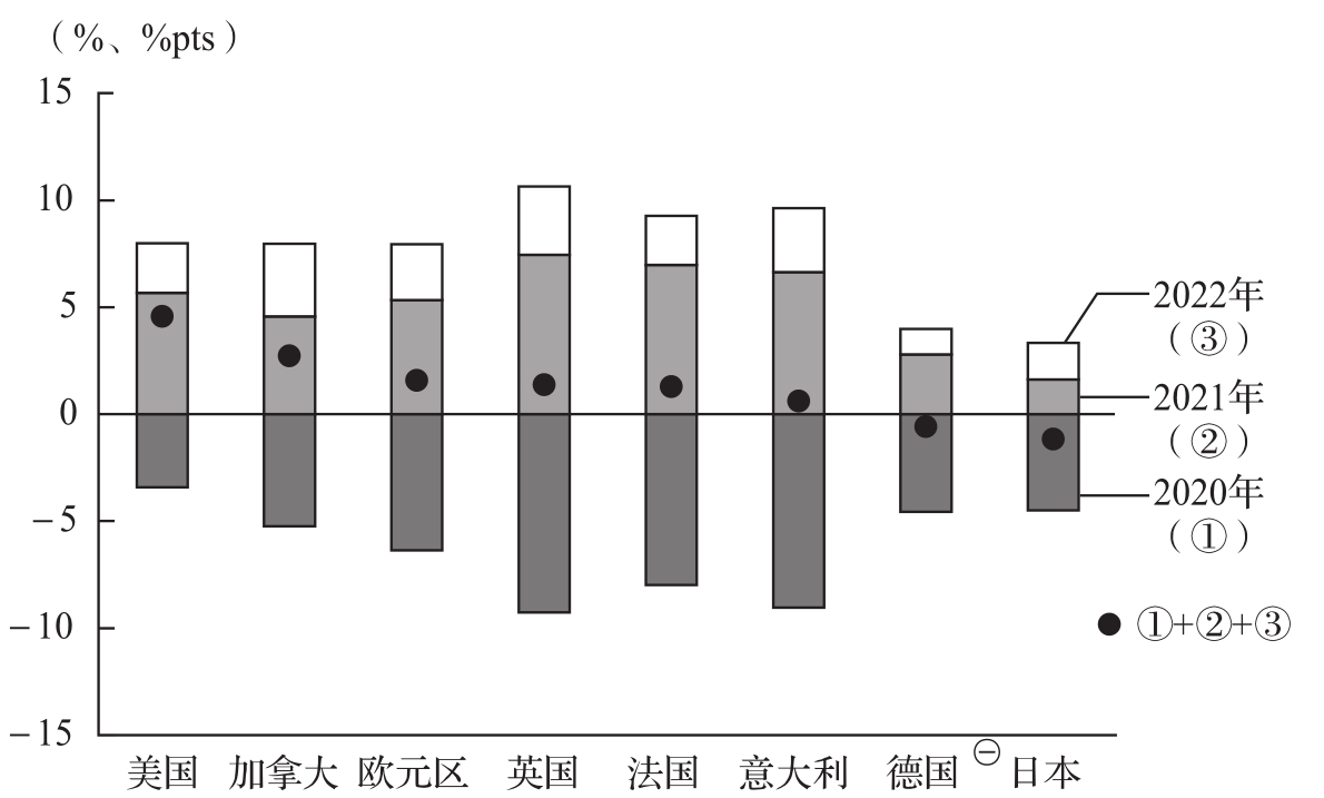 不少人简单地说“欧美国家2020年经济大幅下行,而2021年又大幅回升”,但这种说法并不完全正确。图1-3比较了2020年、2021年日本和其他几个主要国家的实际GDP增长率和2022年实际GDP增长率的预测值,这些数据均来源于国际货币基金组织(IMF)2022年7月发表的《世界经济展望》。其中,三年增长率之和最高的是美国,为4.6%;而最低的是日本,为-1.2%(负增长)。图1-3所列出的国家中,三年增长率总和为负的只有日本和德国(后者为-0.6%)。可见,日本经济的增长远落后于其他国家。而德国的负增长则与俄乌冲突有关:俄乌局势恶化以来,德国可以看作“半个当事国”,自2022年春季起经济状况急剧恶化。德国在2021年的GDP增长率为2.8%,超过了当年的潜在增长率,因此我们可以认为,德国三年总和的负增长完全是受俄乌冲突影响。倒不如说,在2022年7月这个时间点,日本的经济情况竟然比德国这个俄乌冲突的“半个当事国”还要差。