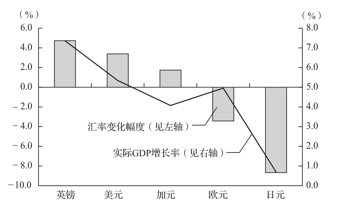 图1-2 2021年G7各国汇率变化幅度和实际GDP增长率