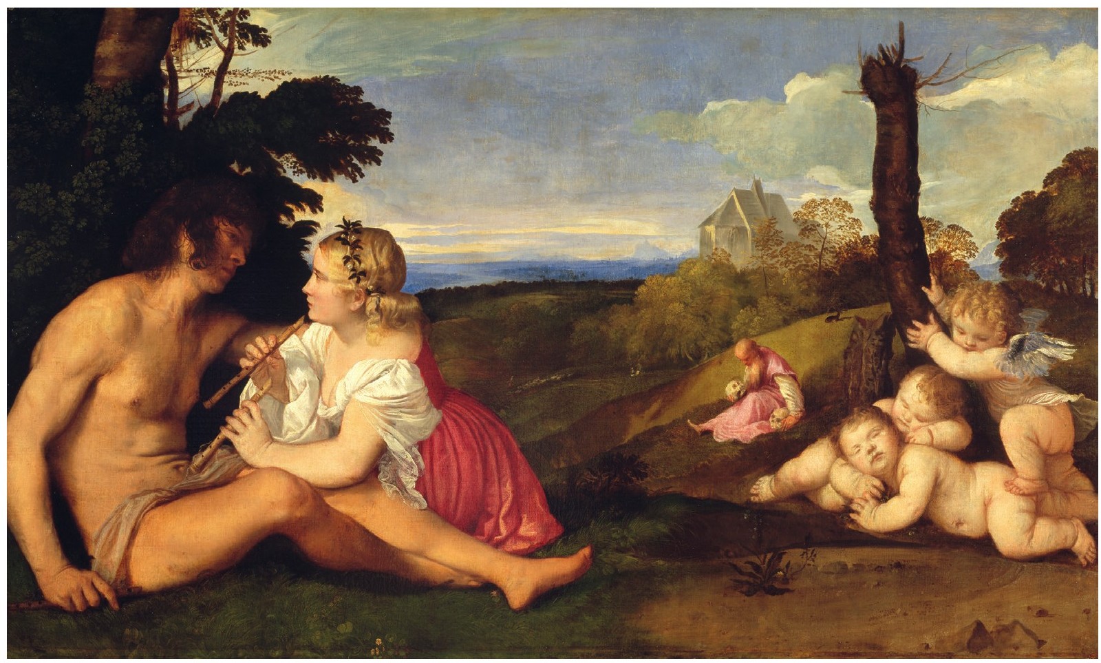 )等作品中,这两种风格之间的潜在冲突被消除了。在提香的笔下,微风吹拂着牧场,矮小的树木散布其间,远方的建筑物若隐若现,地平线呈现为蓝色与金色——这样的风景会令人想起乔尔乔内。但风景仅仅是配角,其视觉形象或象征意义是为了呼应整幅画面的意义,而传达画面意义的则是前景中各位主人公之间的激烈互动。