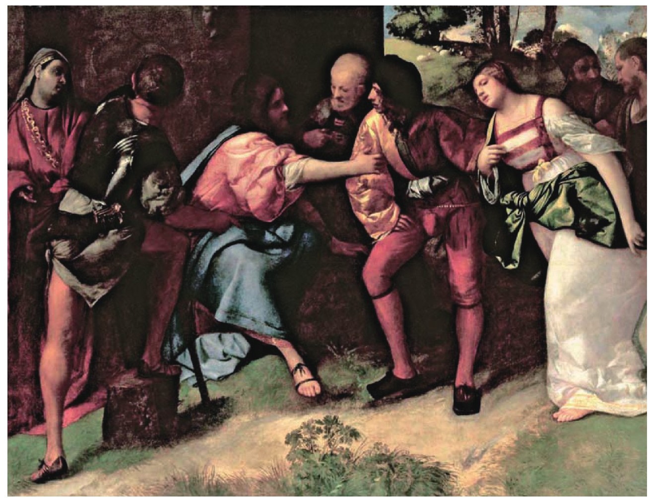 图19:提香, 《耶稣基督与水性杨花的女人》 ,约1508至1509年,格拉斯哥开尔文格罗夫美术博物馆(Kelvingrove Art Gallery and Museum)
