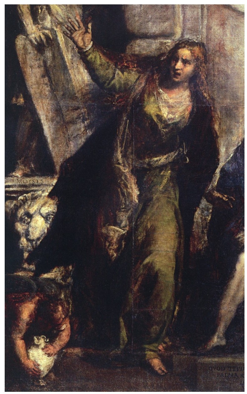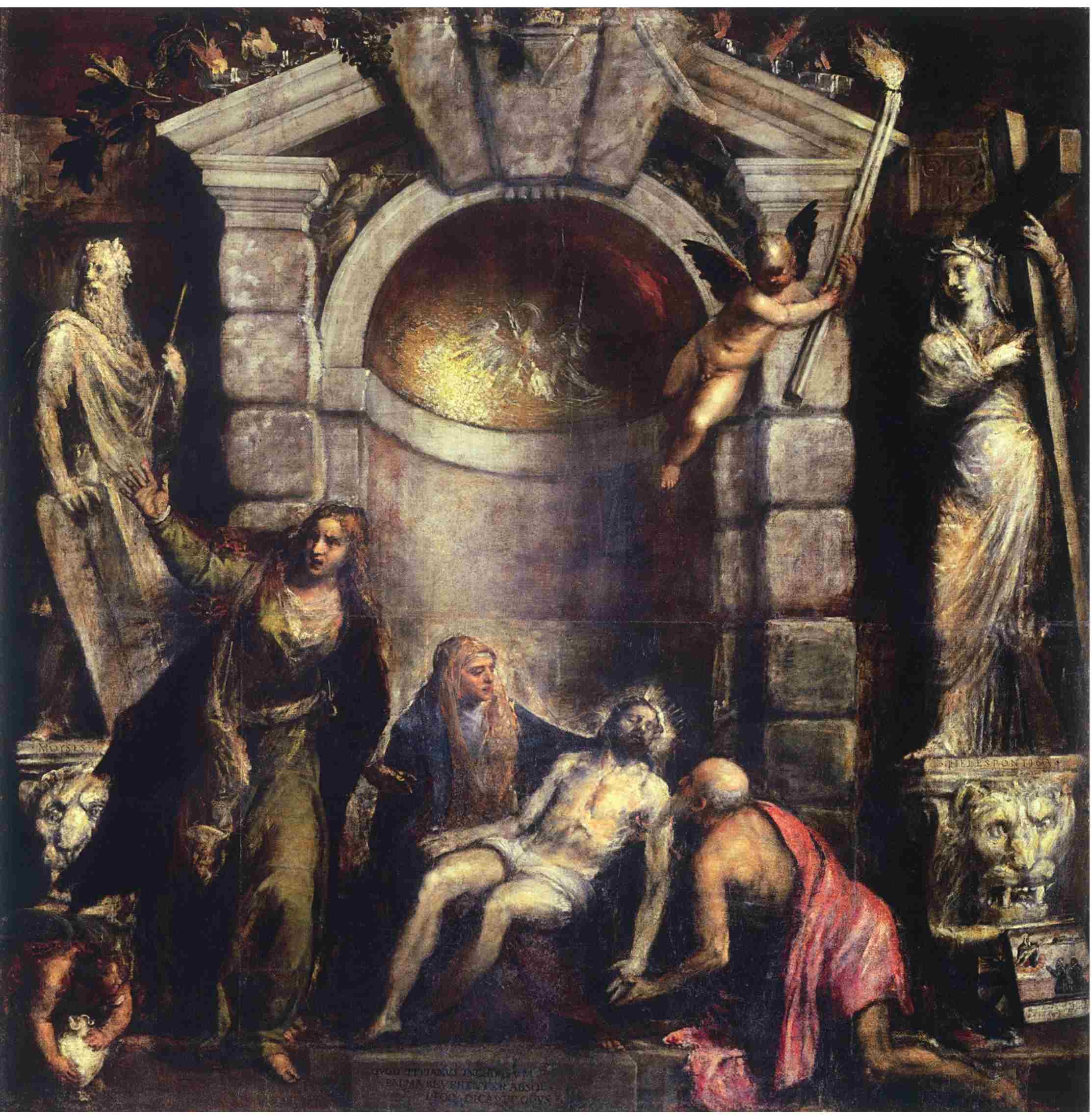 带有半圆形穹顶和马赛克天花板的礼拜堂,同样出现在提香的《圣殇画》中,这是在有意识地向乔瓦尼的经典作品致意。然而与乔瓦尼的画作中鲜活、敞亮的礼拜堂相比,提香笔下的礼拜堂的建筑结构却构成了一幅严酷、冷漠的背景,它那饱经风霜的凝重外表,不再与其前方的人物融为一体。哪怕我们解读出了其中古老的象征意味——庞大的拱石代表作为基督教信仰根基的耶稣;马赛克图案上一只鹈鹕正敞开胸膛哺育幼鸟,这代表耶稣的牺牲受到了认可;此外还有摩西以及赫勒斯滂的西比尔(Hellespontine Sibyl)等先知人物的雕像,这些常见的圣像画元素的重要性也不免大打折扣了。