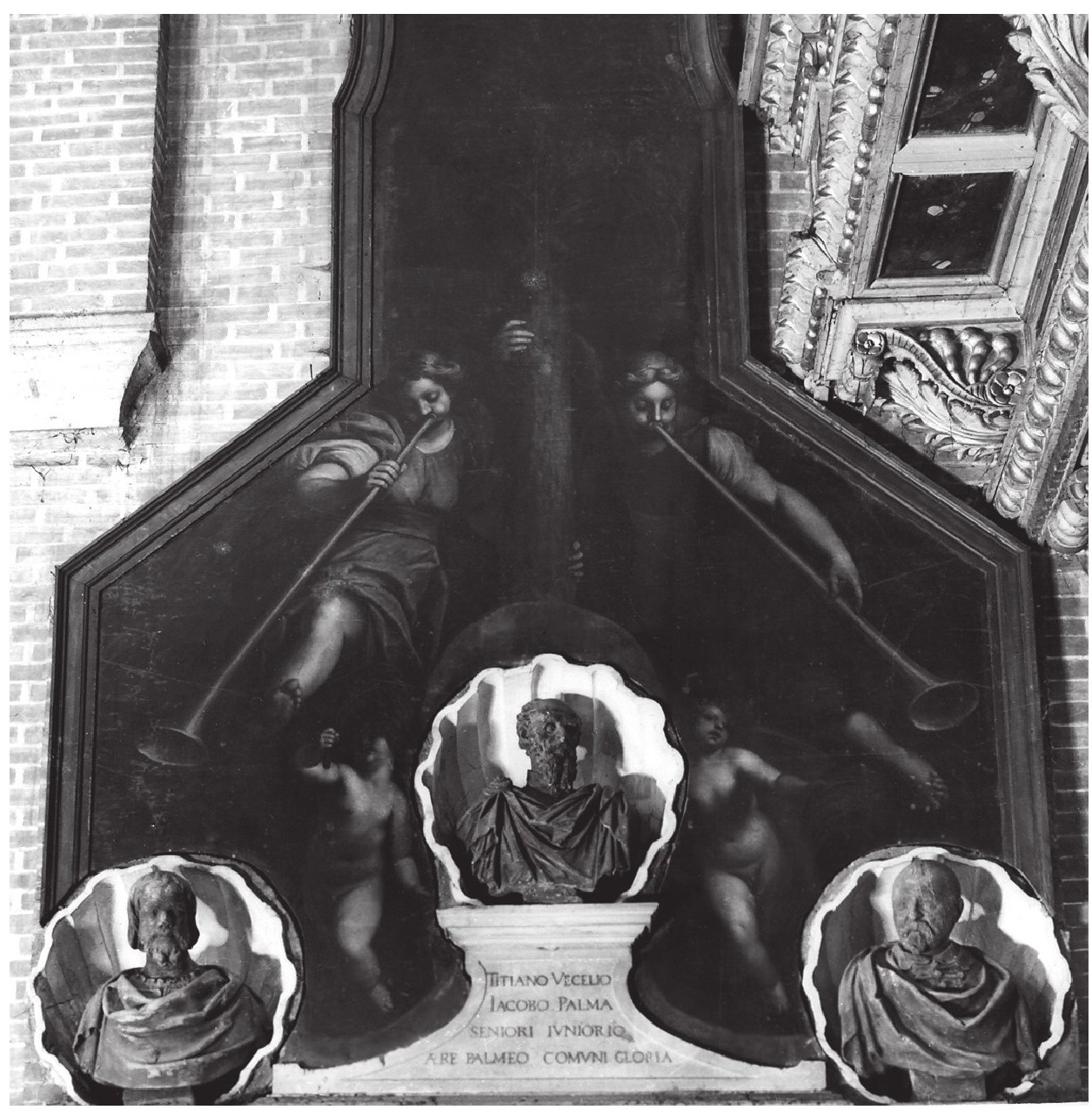 ,在雕塑家雅各布·阿尔巴雷利(Jacopo Albarelli)的协助下,小帕尔马在多明我会的圣若望及保禄教堂(Church of Santi Giovanni e Paolo)圣器室的门前竖立起了一座纪念碑,将自己刻画为这位大师在艺术上的儿子与继承人(图5)。