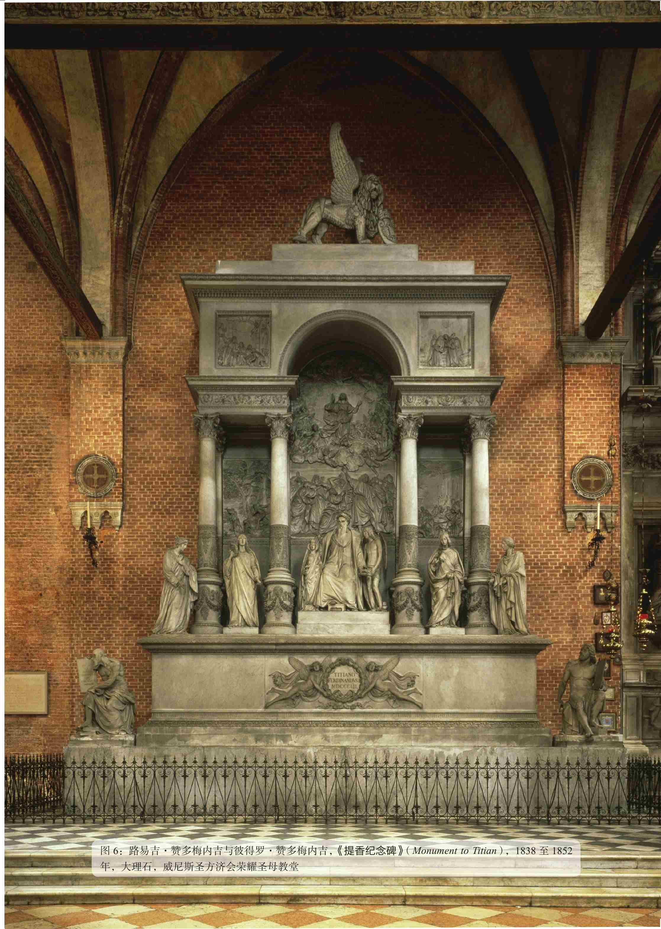 尽管小帕尔马于17世纪20年代末成功地竖立起这座纪念碑,但这并不意味着威尼斯在此时为提香举办了盛大的纪念活动。这座纪念碑的规模相对较小,图案也很贫乏,小帕尔马还趁机将提香纳入一套宏大的艺术谱系,借此为自己增光添彩。考虑到这些因素,提香本人想必不会对此感到满意。事实上,直到200多年后,威尼斯人才竖立起了一座专门向提香一人致敬的纪念碑(图6)。
