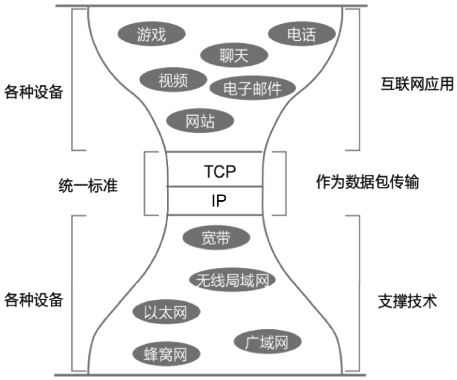 TCP/IP协议的“沙漏”模型如图4-1所示