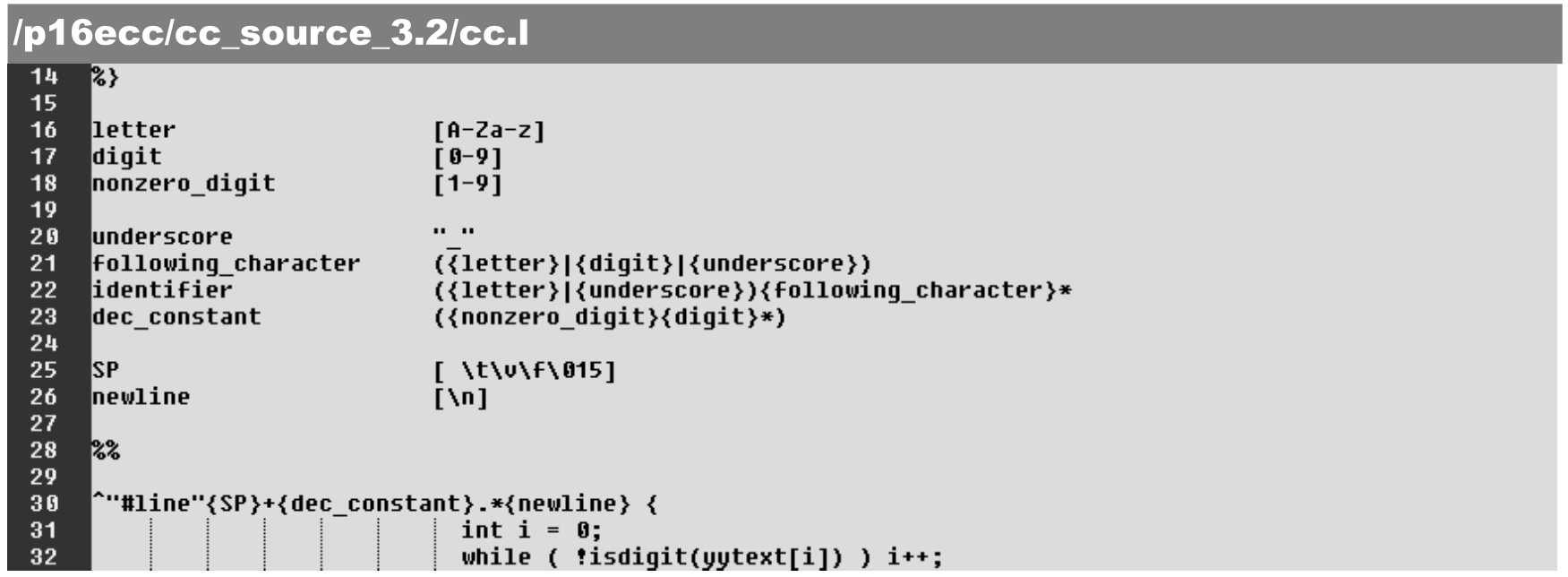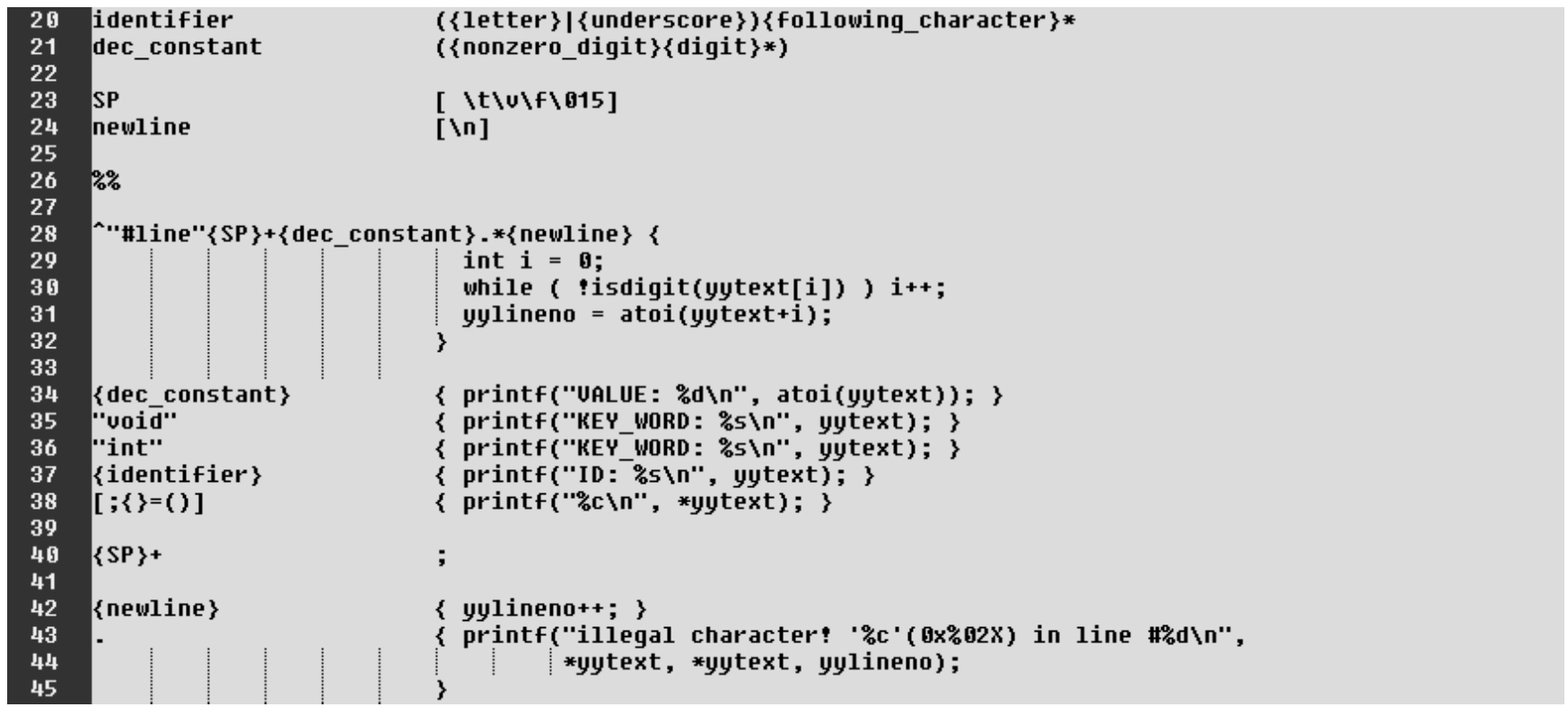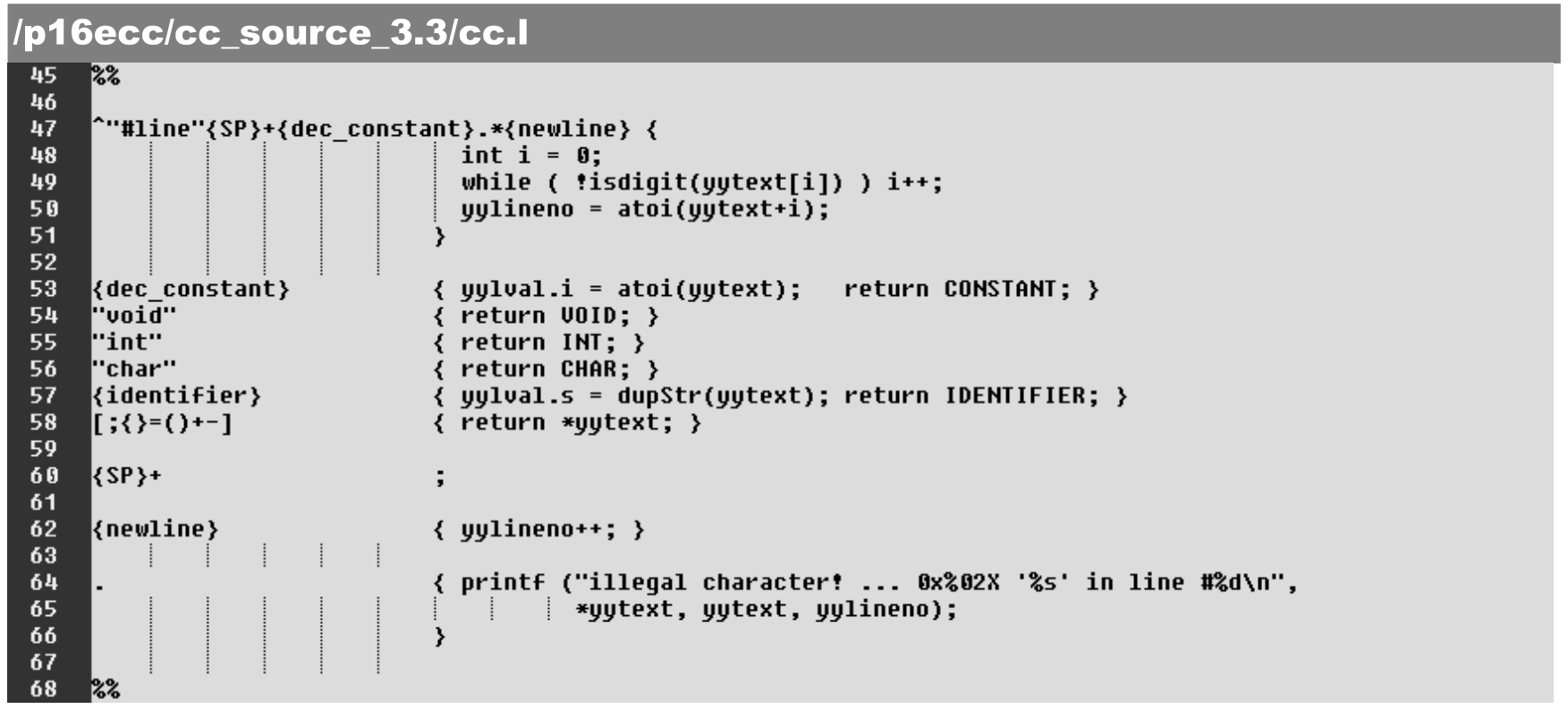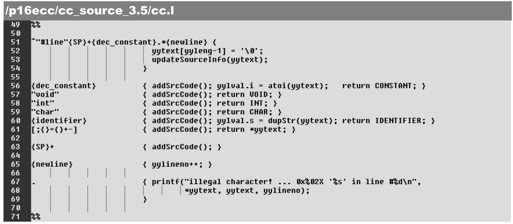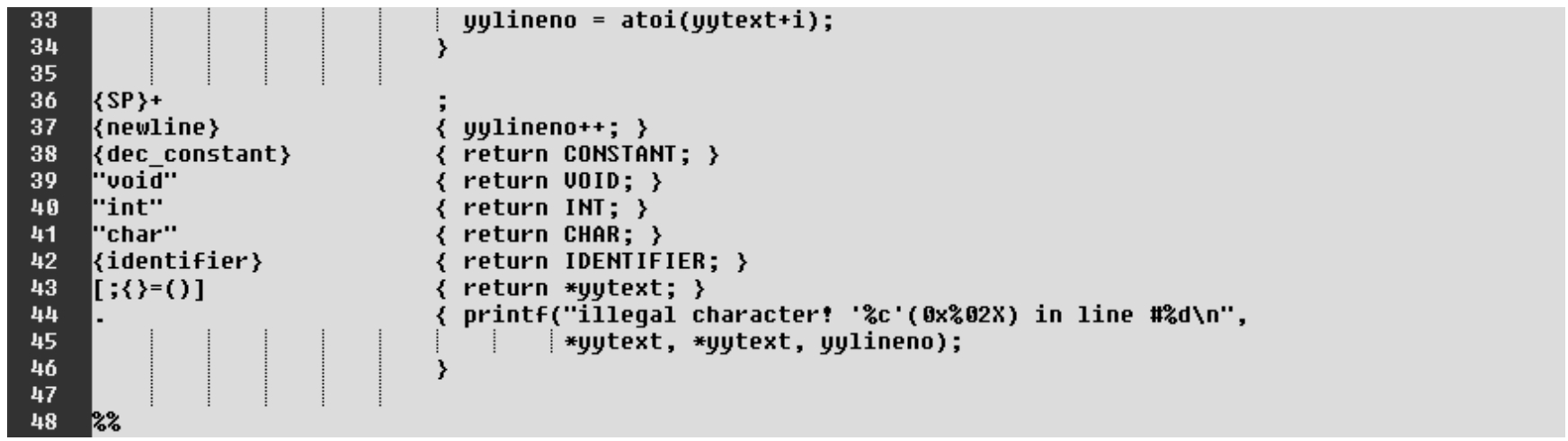 ·第38~42行:(关键字)识别成功,返回其token值。注:词法解析返回值{CONSTANT,VOID,INT,CHAR,IDENTIFIER}被定义在cc.y文件中,由bison将其生成在cc.h文件中。它们的值处于≥256的范围,以便区别常规ASCII字符数值。