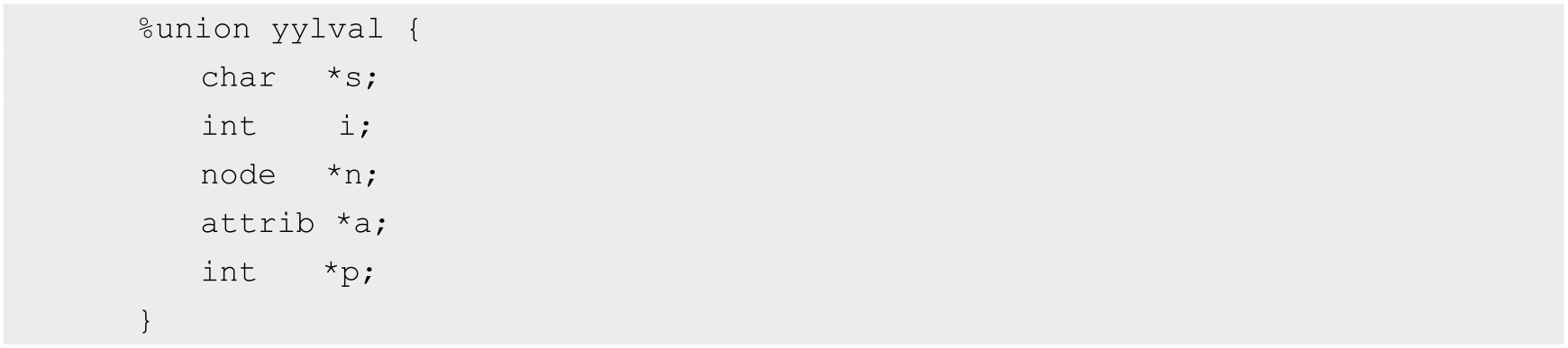 yylval 是bison/flex中定义的数据,用于表示和容纳各节点或 token 数据,并采用联合(union)的数据结构以涵盖各种类型的数据。而数据成员类型及命名,则由使用者自行确定。在本节中,将yylval的内部成员定义为: