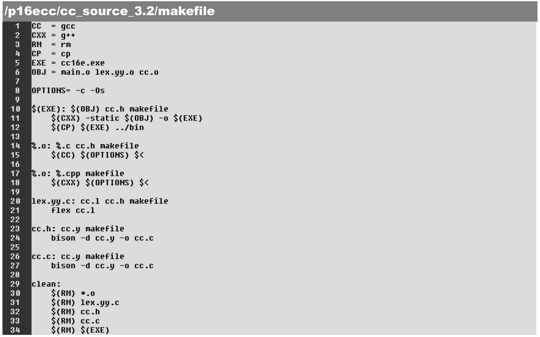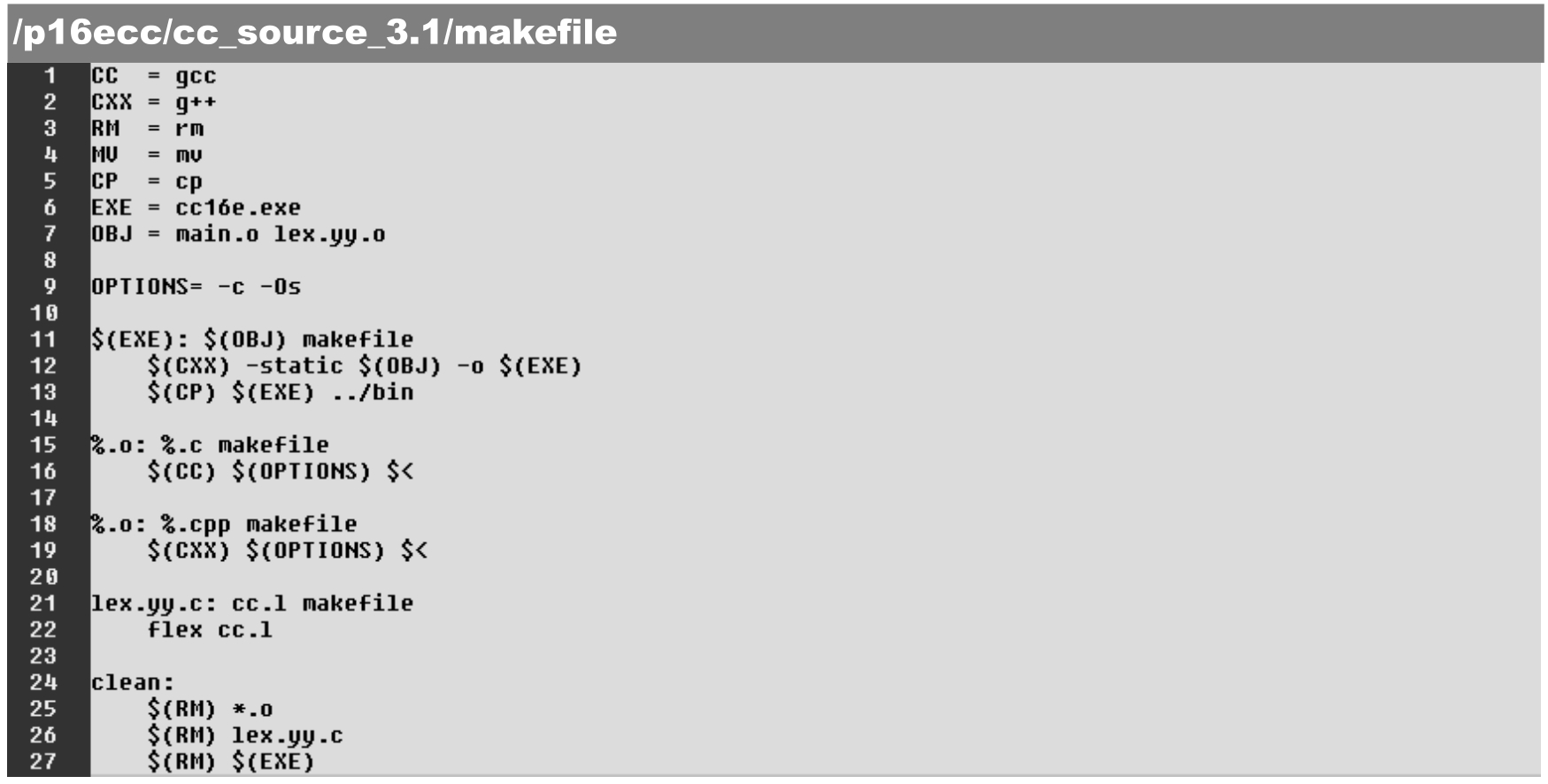 本识别器主要包含cc.l和main.cpp两个源程序文件,经编译后生成cc16e.exe可执行文件。其工程项目文件makefile如下。