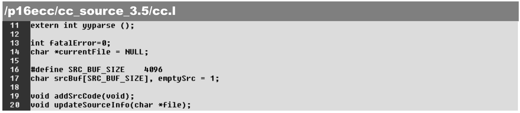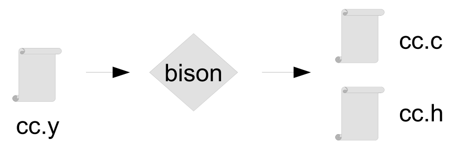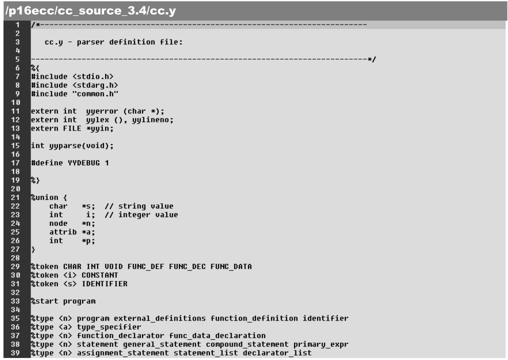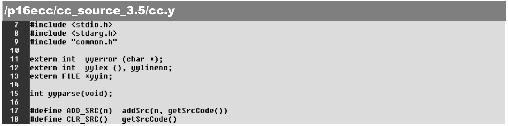 cc.c和cc.h这两个文件是cc.y文件经由bison生成的语法解析器的C语言程序,其形式同样是一组以“yy”或“YY”为起始字符的函数和变量。例如,yyparse()为语法解析器启动函数。