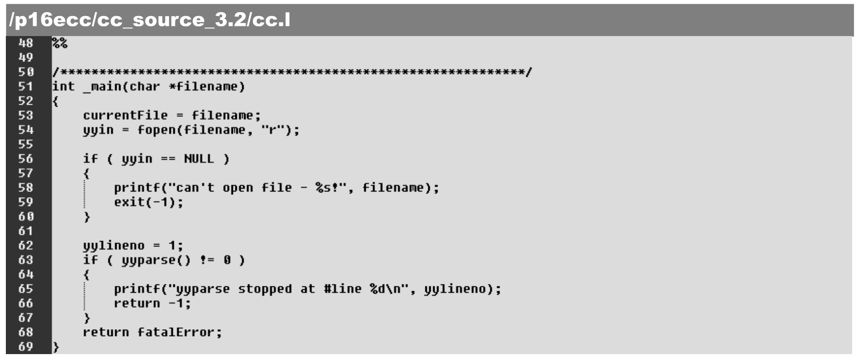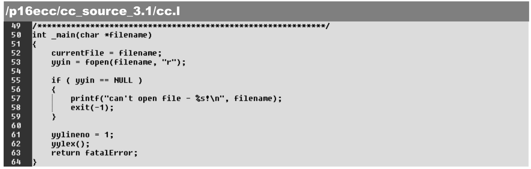 cc.l文件中的_main()函数可以打开输入文件,并启动词法解析,具体如下。