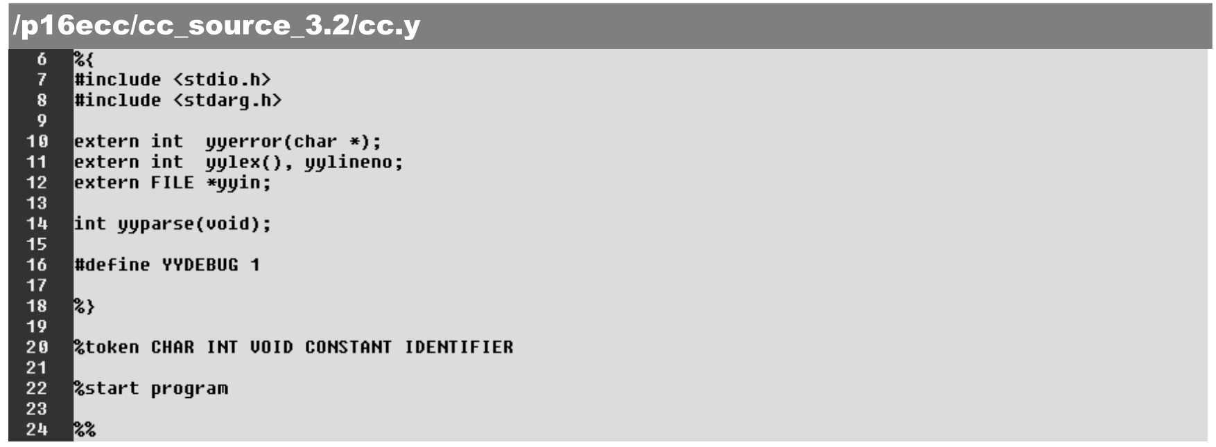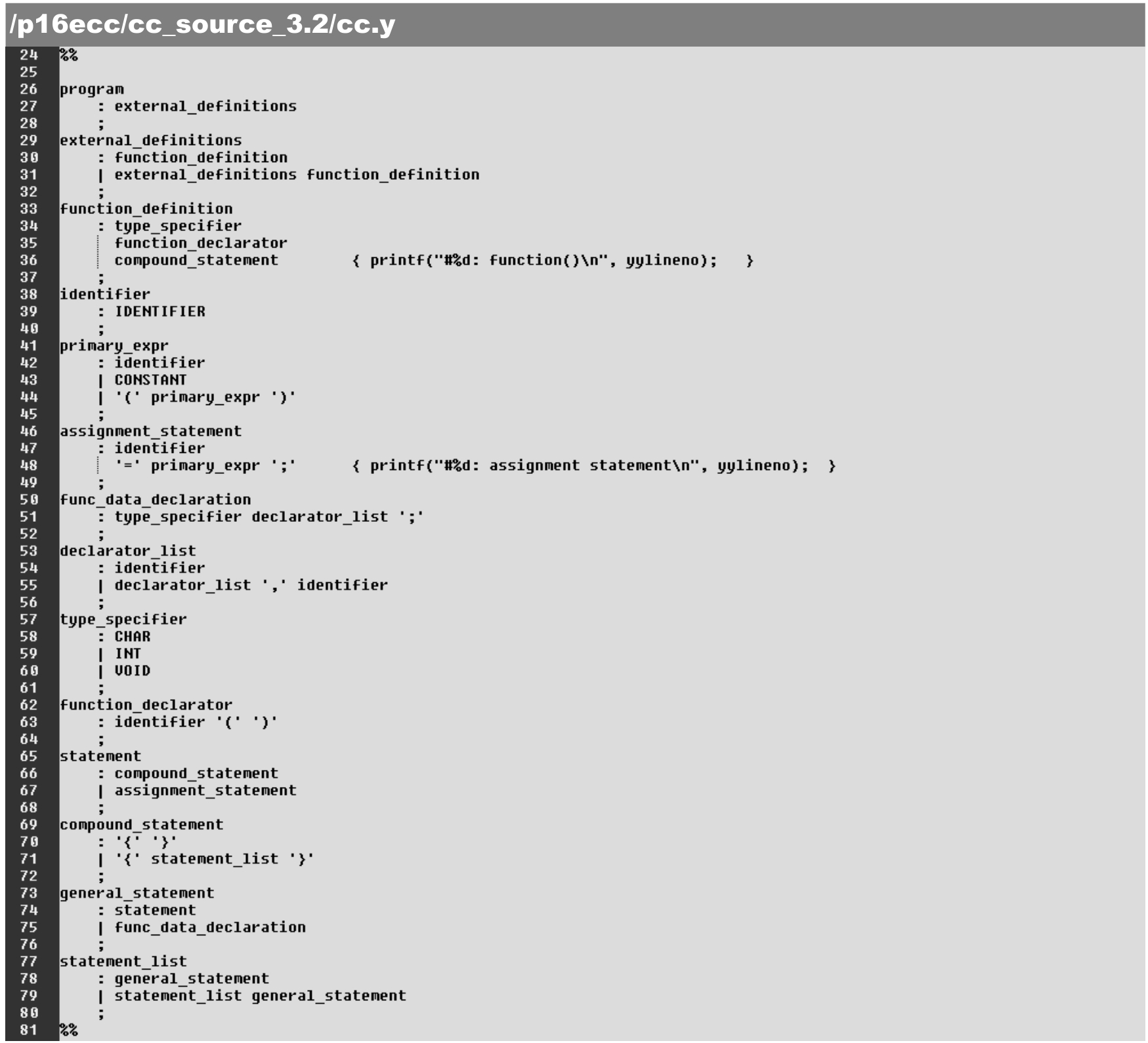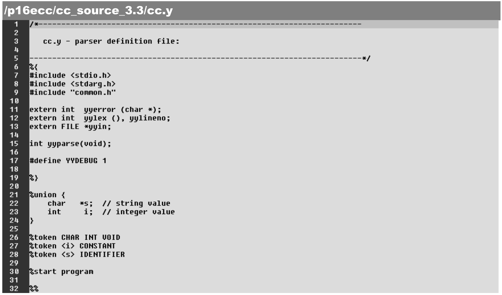 第26~28行:终节点token类型枚举,所有由“%token”定义的标识符将被列入枚举(enum语句)列表中,通过cc.h文件输出,供cc.l文件引用。其中,CONSTANT用来追加其yylval的成员类型为i(%union中的整数成员“int i;”);IDENTIFIER用来追加其yylval的成员类型为s(%union中的字符串成员“char*s;”)。