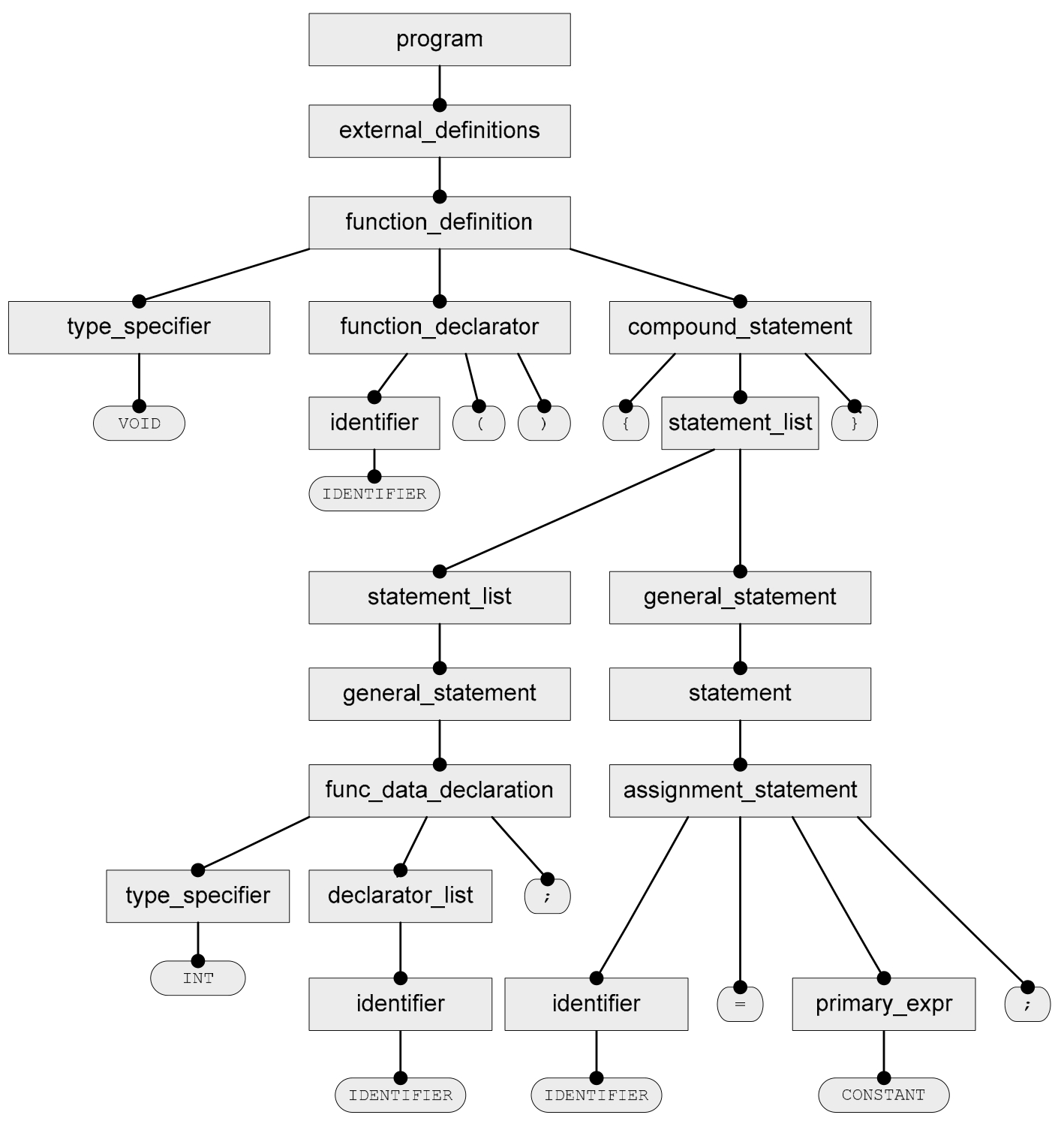 (5)当语法解析完成后,对全部输入进行识别、匹配,其过程及结果便构成了“编译树”或“语法树”。其中,“枝干”部分对应识别规则,“树叶”对应各种token。