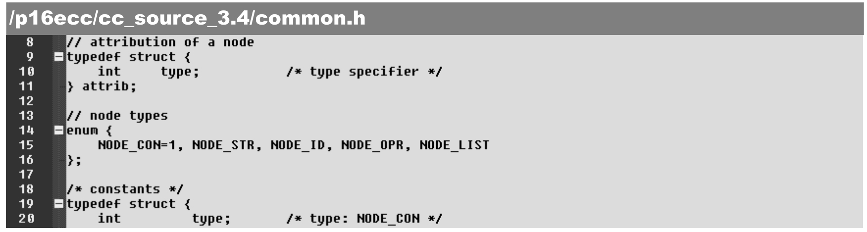 相应地,为了在语法解析过程中将获得的源程序片段存入编译树中,需要在 common.h文件中对各类node的数据结构进行扩充,具体如下。