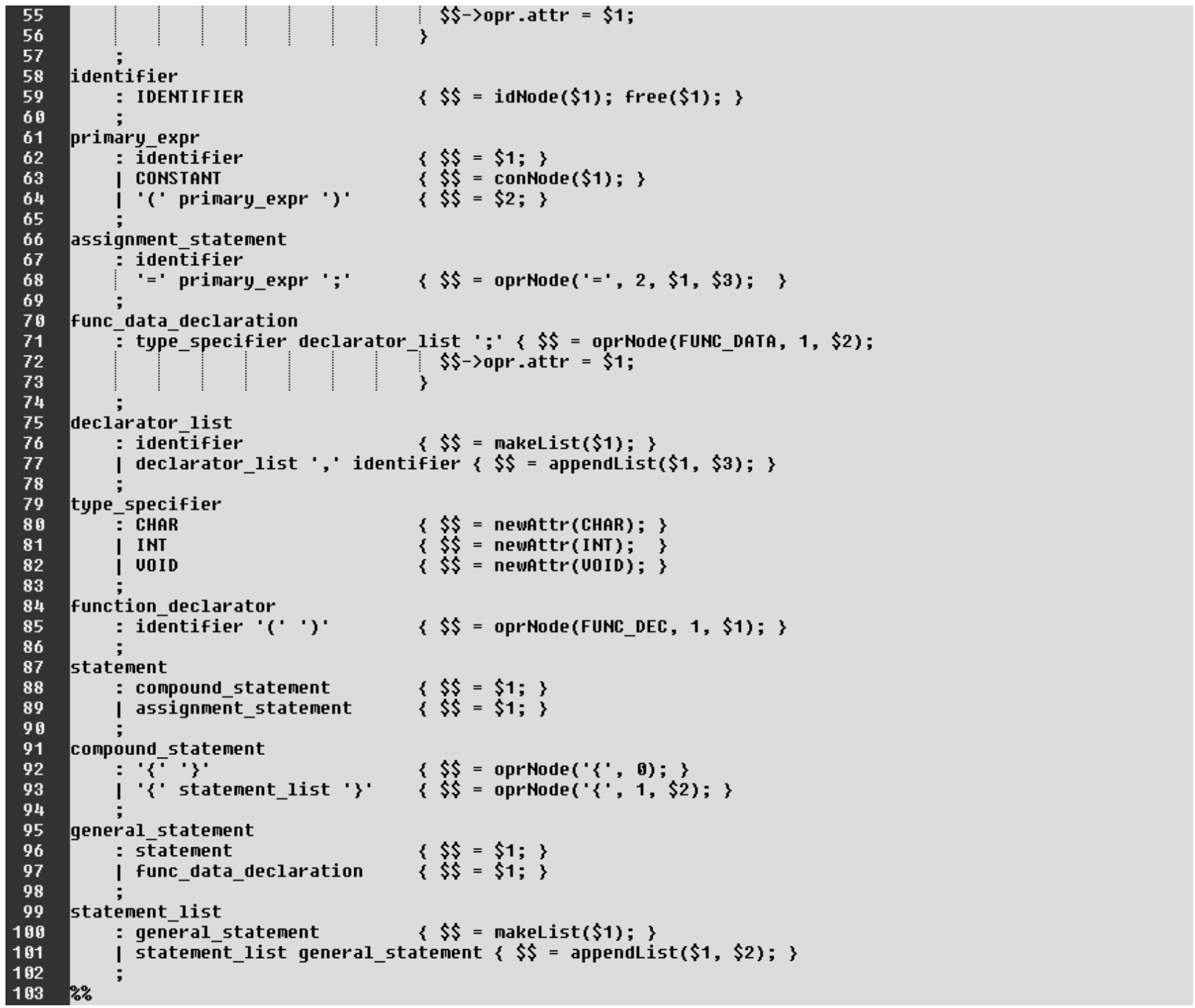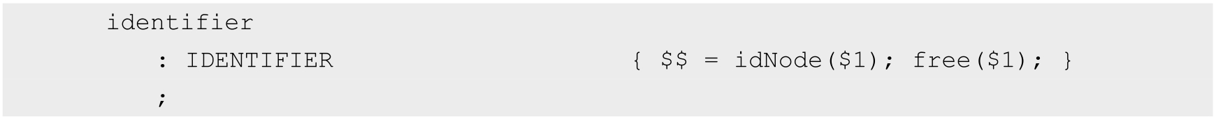 其中$1是IDENTIFIER本身的yylval(类型为“char*s;”),由idNode()函数生成类型为idNode_t的数据节点,最终传递(赋予)归纳后的节点为identifier,并释放IDENTIFIER在(flex中)生成时占用的内存。