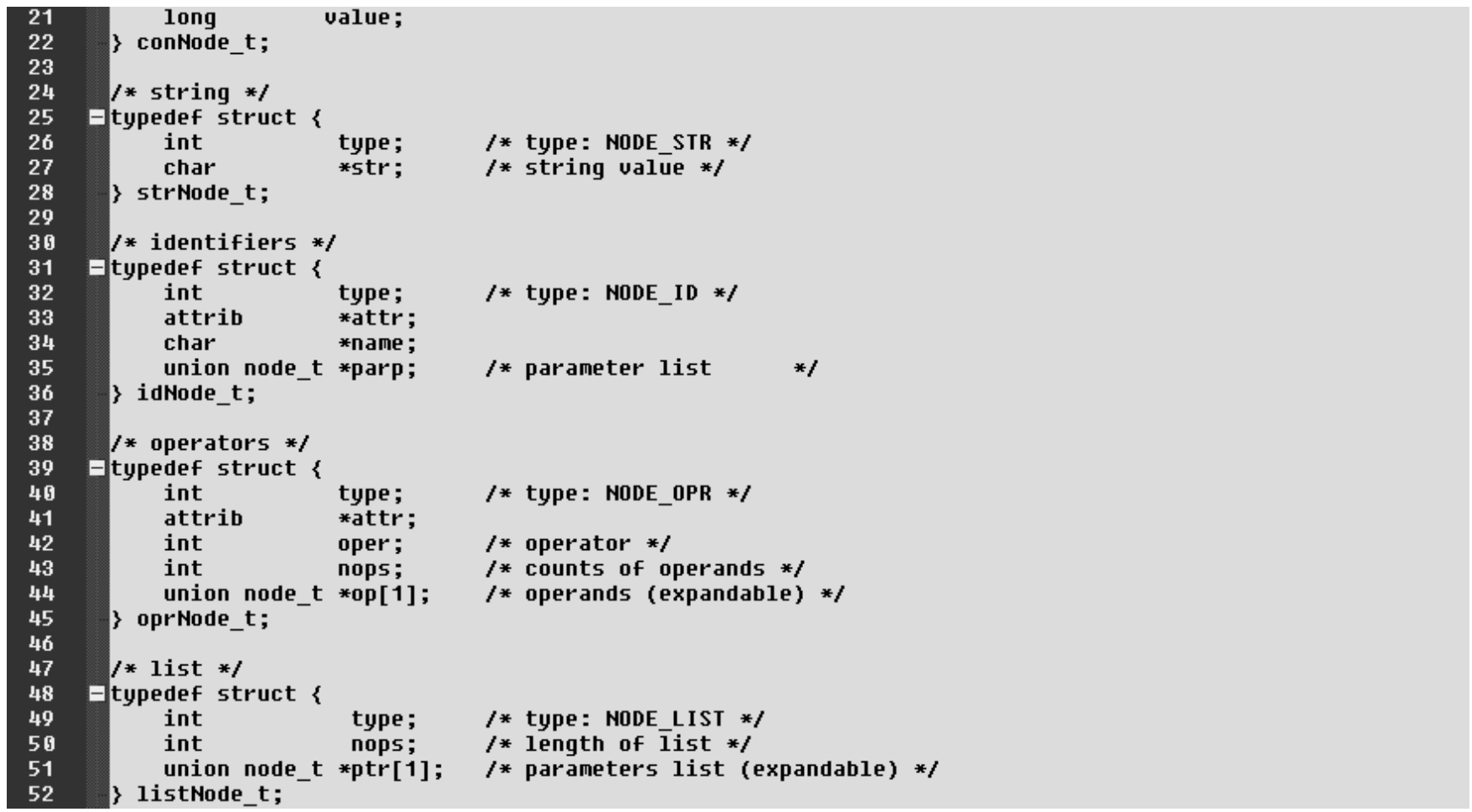·第18~52行:各种节点的具体数据结构定义。注:每一种节点结构的首端都必须为“int type;”。