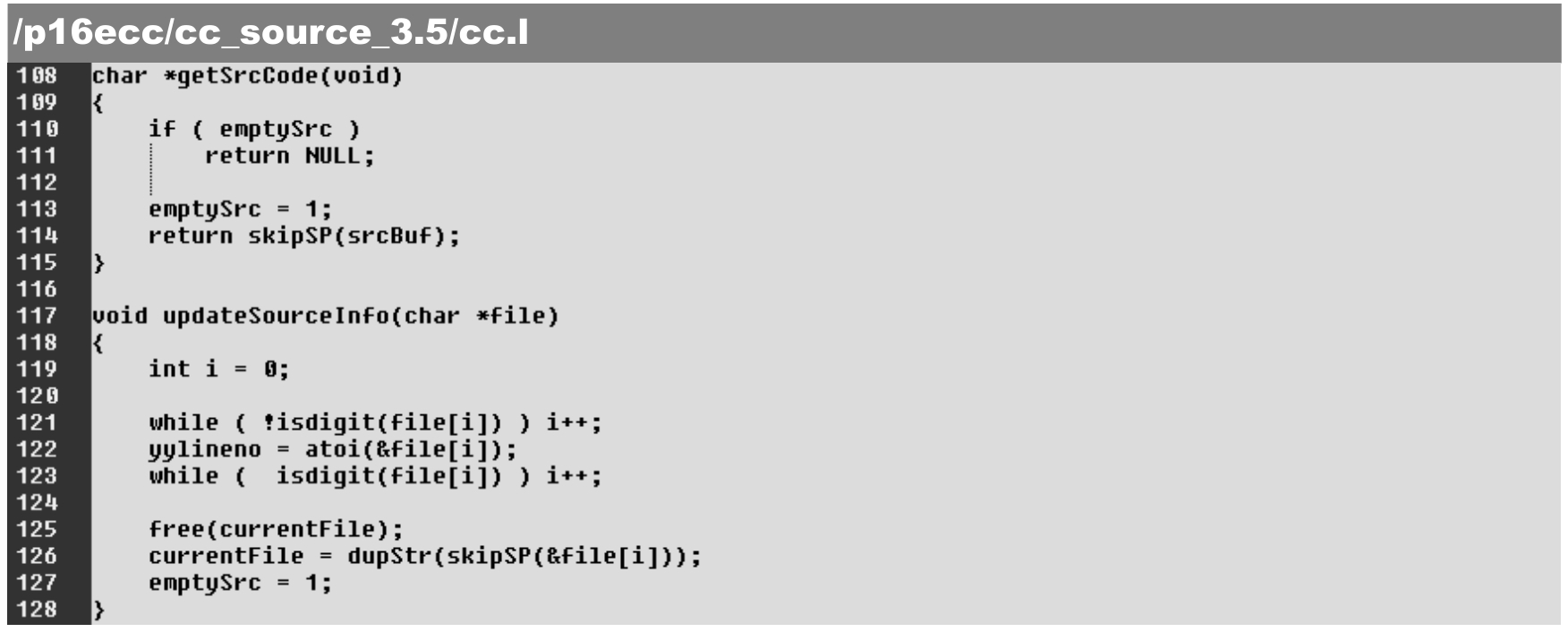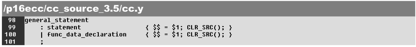 ·第108~115行:getSrcCode()函数在语法解析的cc.y文件中调用,用来获取当前缓冲区内源代码片段;结束时设置emptySrc,用来清空缓冲区。