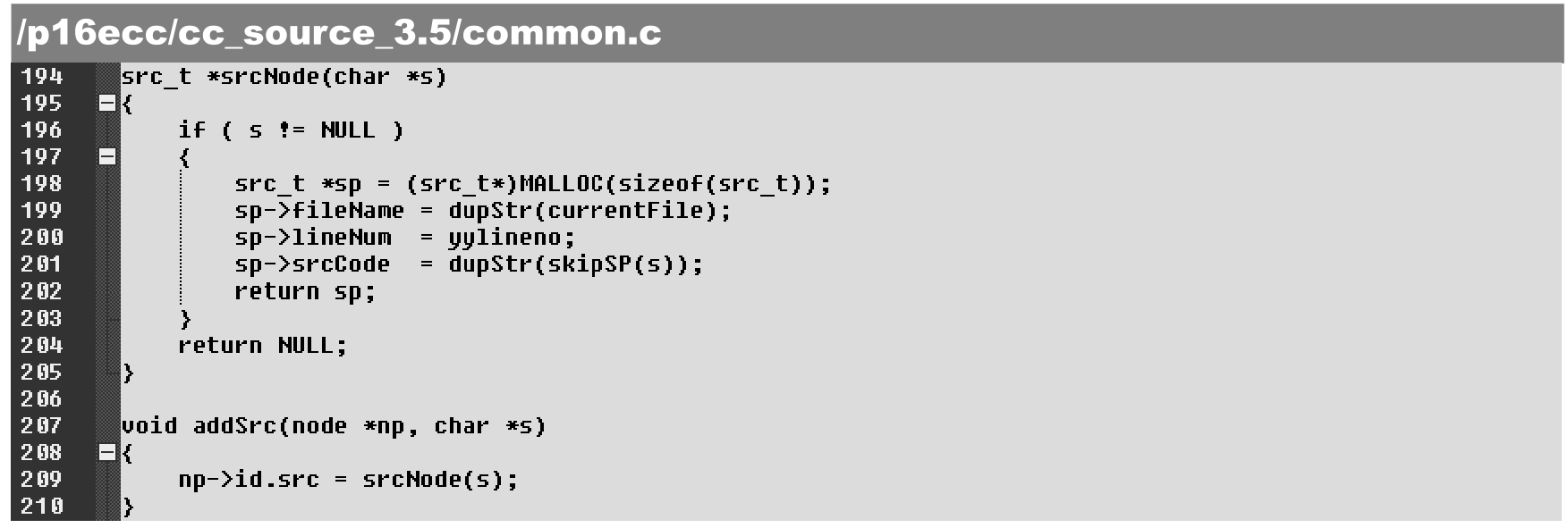 ·第194~205行:通过srcNode()函数创建src_t结构,并填入当前输入文件信息,以及源代码缓冲区内容。