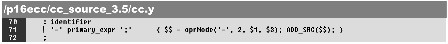 ·第70~72行:赋值表达式识别规则,将缓冲区内的源代码嵌入归纳后的节点(随后自动清除缓冲区)。