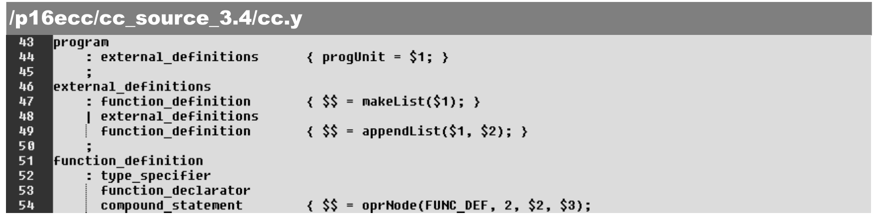 与此同时,在产生式中增加了匹配后的处理(C 语言格式的语句代码)。将节点序列标记($1、$2、…、$$)作为运算变量,具体如下。