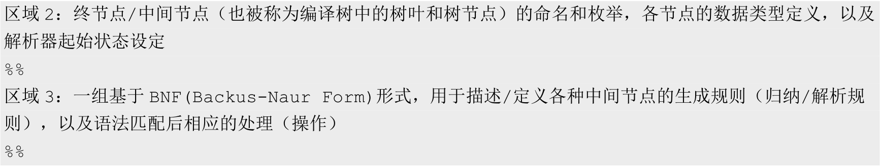 语法解析器文本是纯ASCII文本形式的文件。与词法解析器文本格式类似,语法解析器文本格式同样从始至终以特殊的字符划分为以下3个区域。